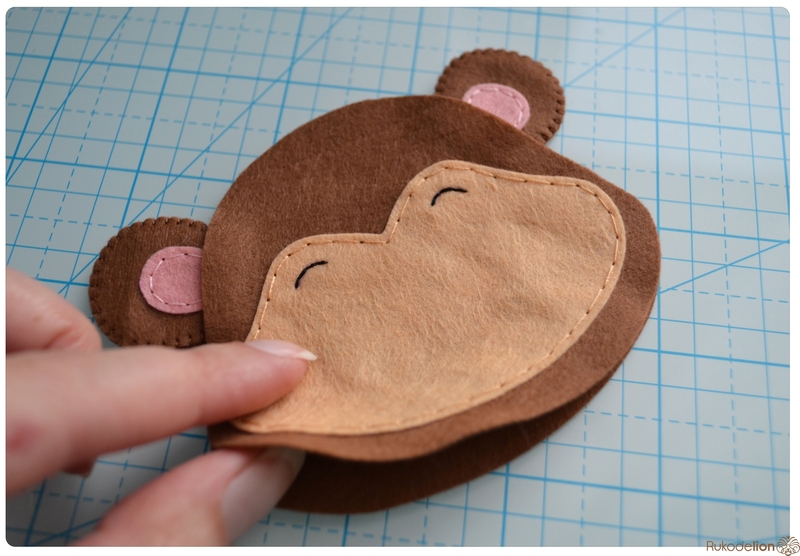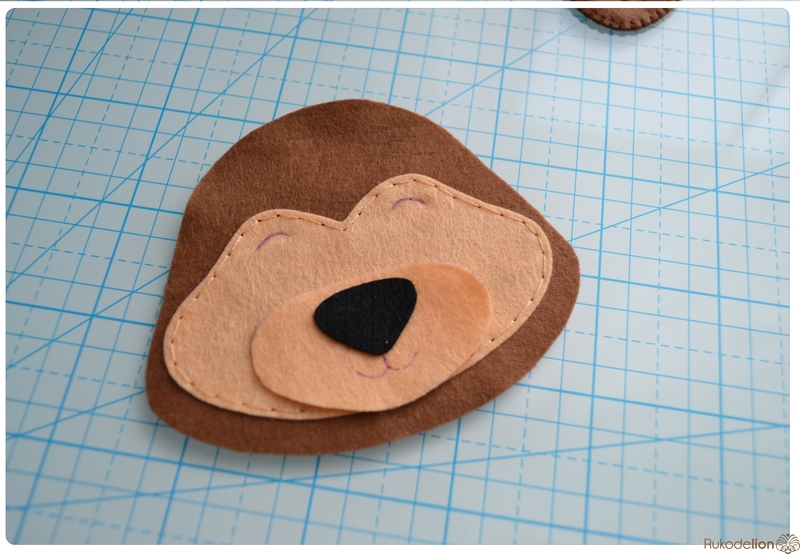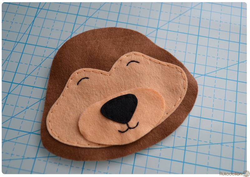 Самоисчезающим маркером рисуем будущие бровки и ротик мишки. К мордочке прикладываем носик. Чтобы сделать такой носик, из черного фетра вырезаем треугольник и закругляем его углы