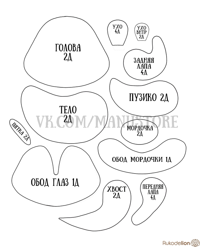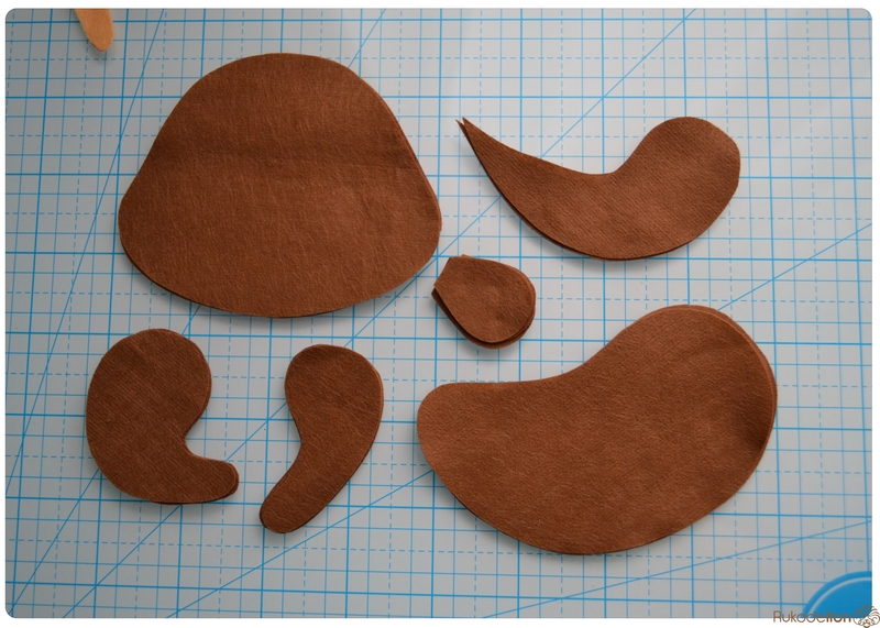 Вырезаем детали по нарисованным линиям. Из коричневого фетра нам нужно вырезать две детали головы, тела и хвоста и по четыре детали ушек, передних и задних лап