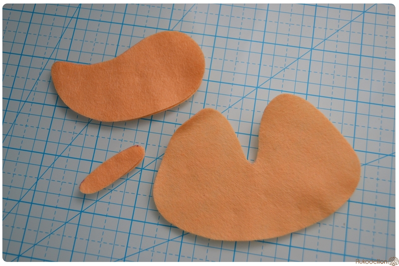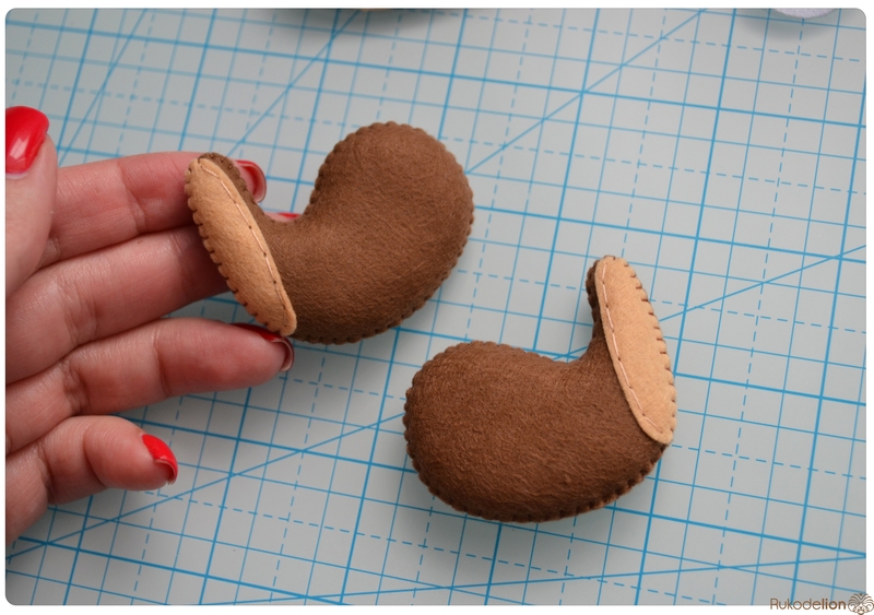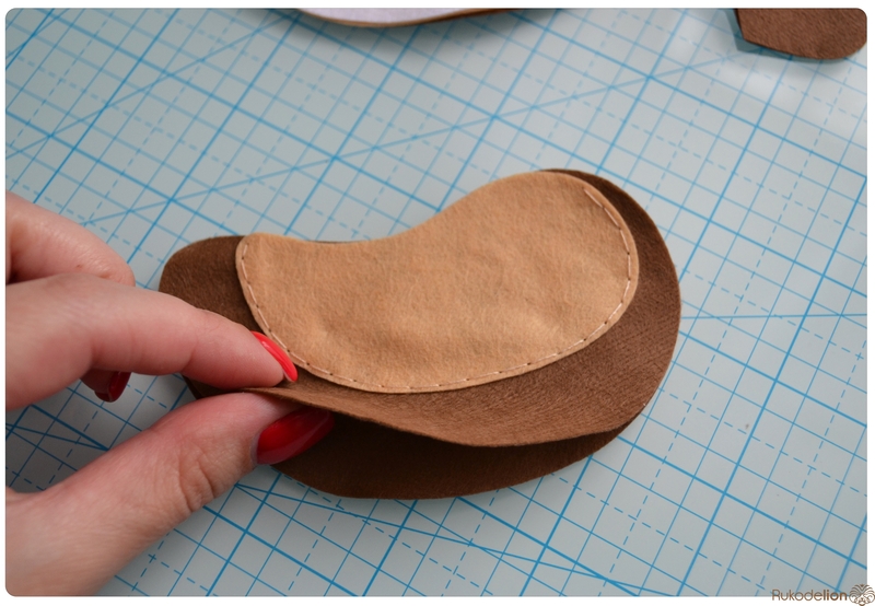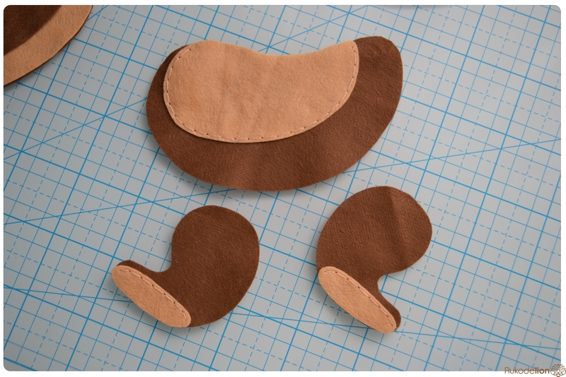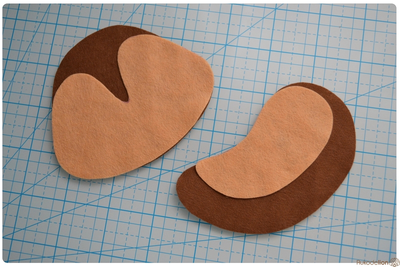 Из бежевого фетра вырезаем по две детали пяточки и пузика и одну деталь обода глаз