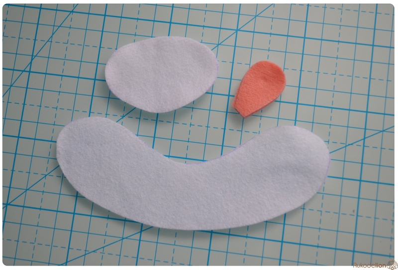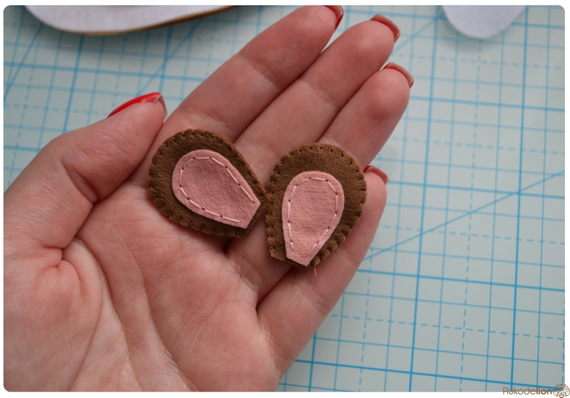 Из белого фетра вырезаем две детали мордочки и один ее обод. Из розового фетра- две внутренних детали уха