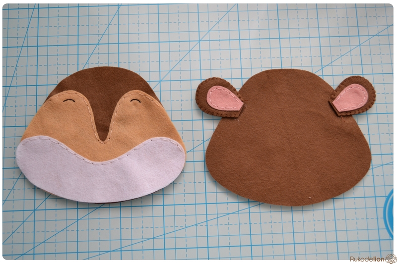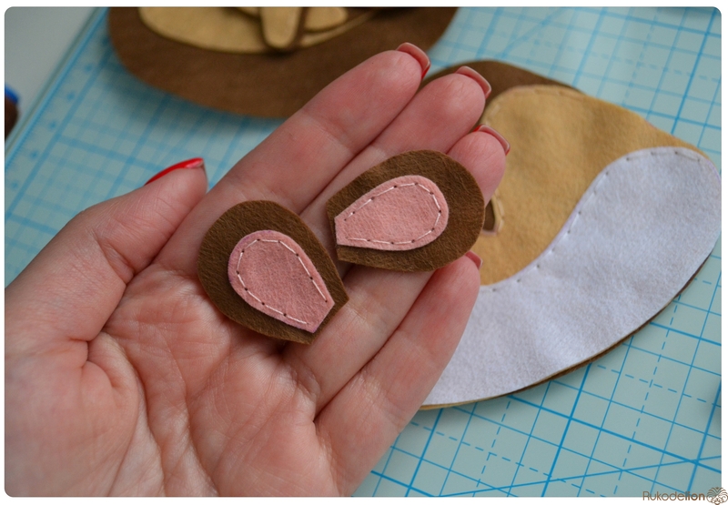 Раскладываем перед собой детали головы. На задней детали, для удобства сшивания, зафиксируем капелькой текстильного клея ушки