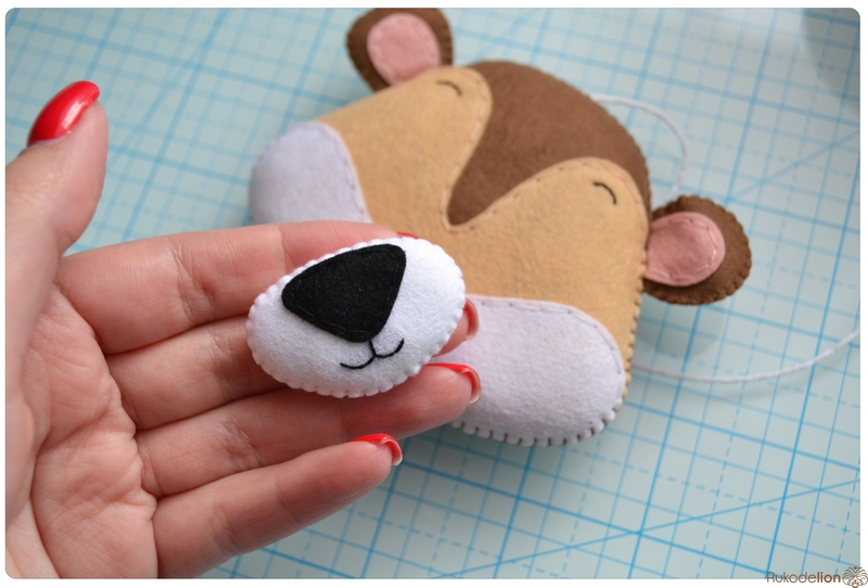 Самоисчезающим маркером нарисуем на голове будущие бровки, а на мордочке - будущую улыбку. Также прикладываем носик к мордочке. Чтобы сделать такой носик, вырезаем из черного фетра треугольник и скругляем его углы