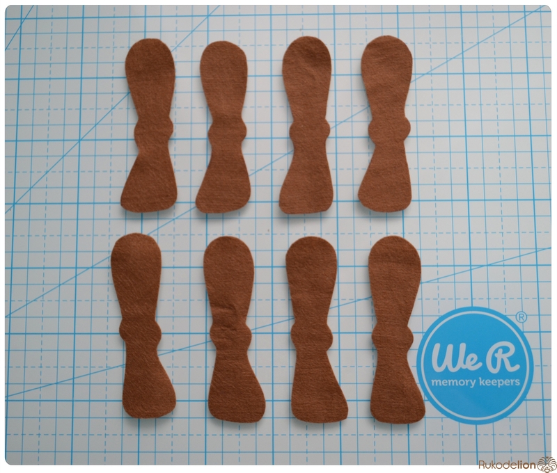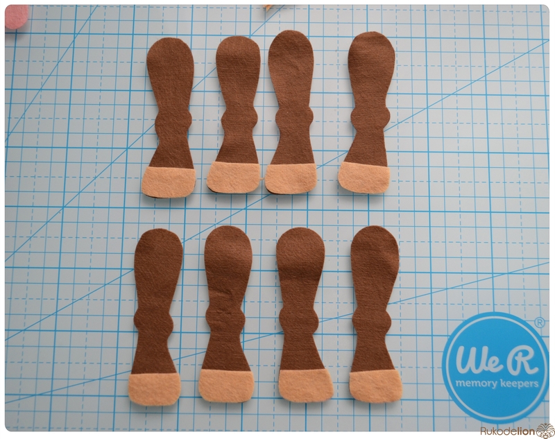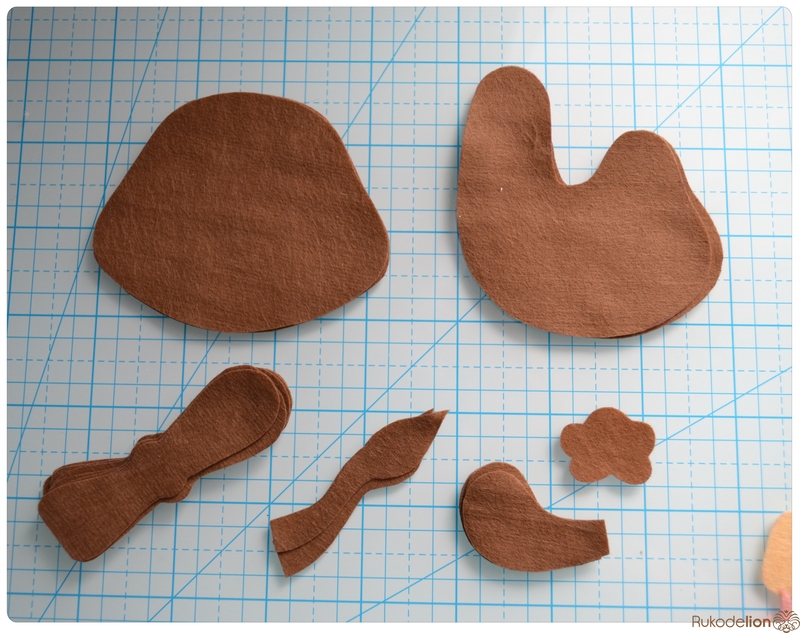 Вырезаем нарисованные детали. Из коричневого фетра нам нужно вырезать по две детали тела, головы и хвоста, четыре детали уха, восемь деталей ножек  и одну челку