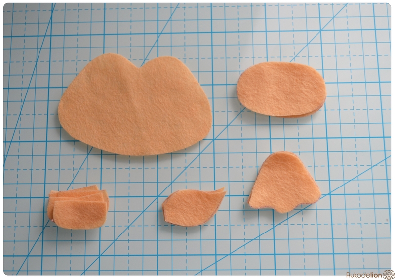 Из бежевого фетра вырезаем по две детали мордочки, горба и кончика хвоста, восемь деталей копытца и один обод мордочки