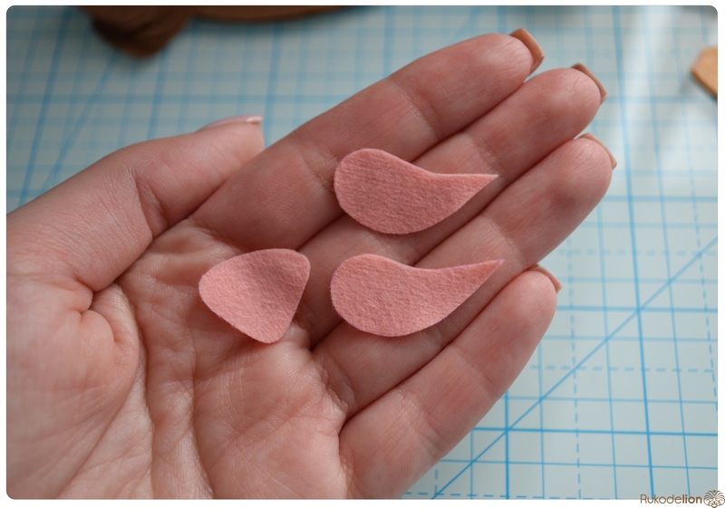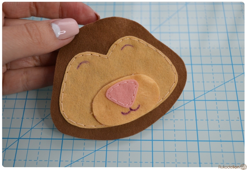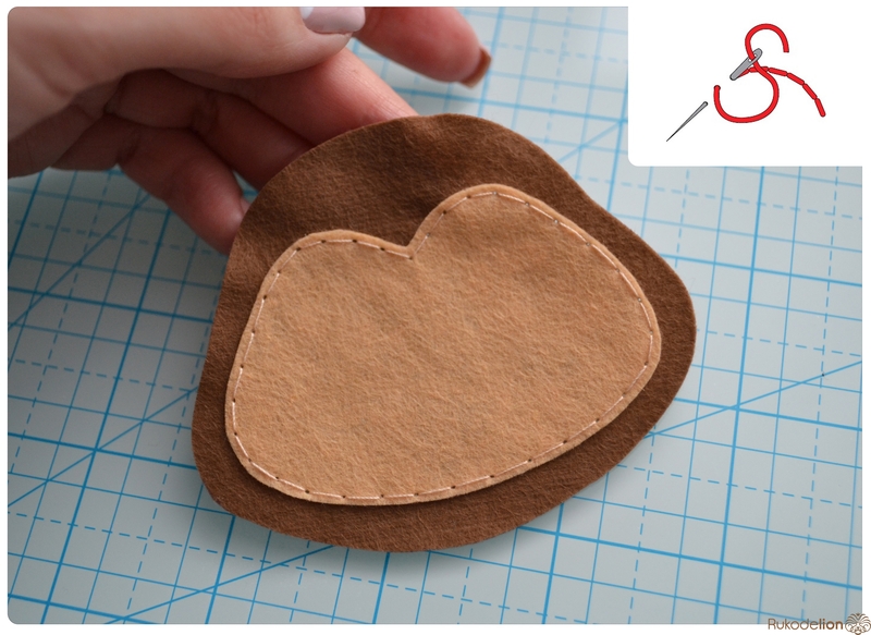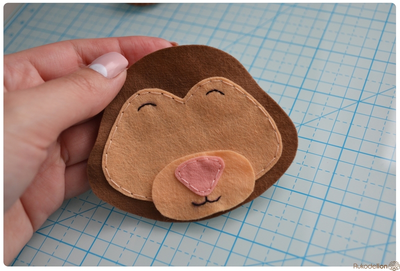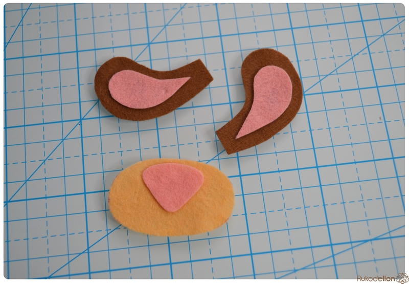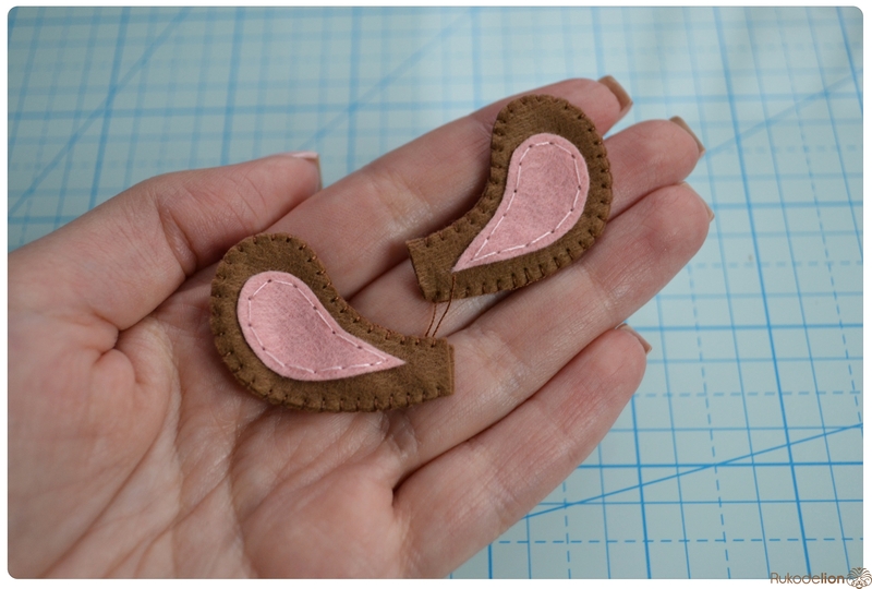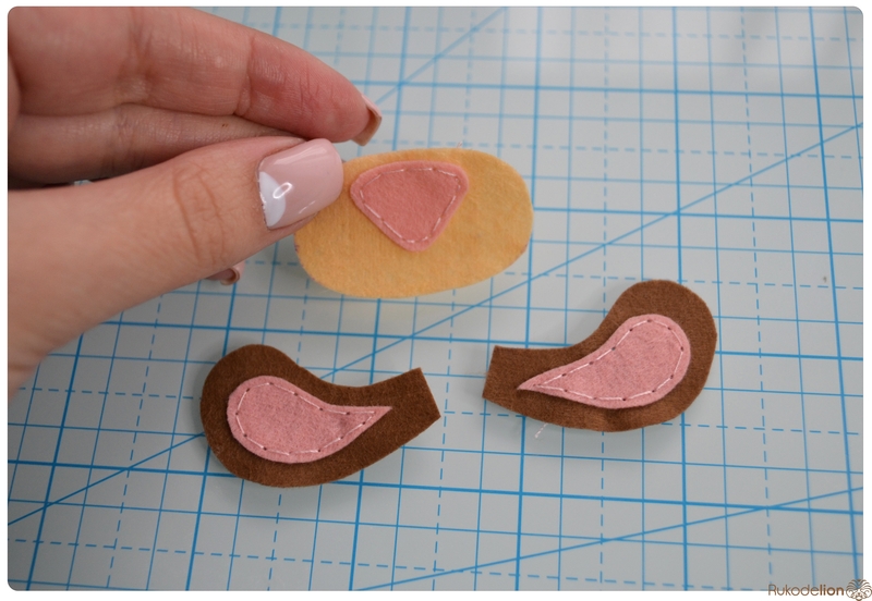 Прикладываем розовые детали ушек к коричневым и носик к мордочке