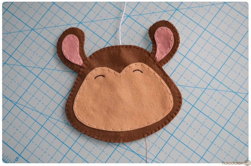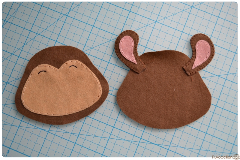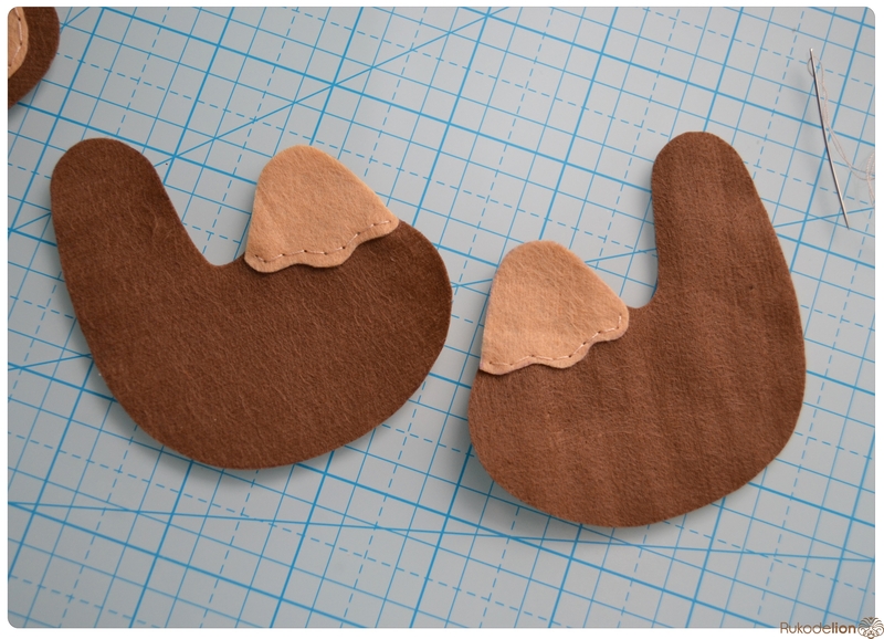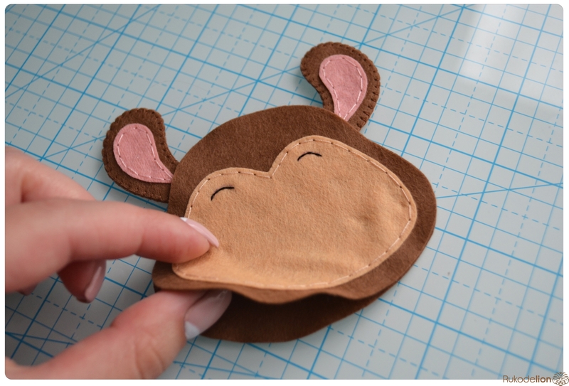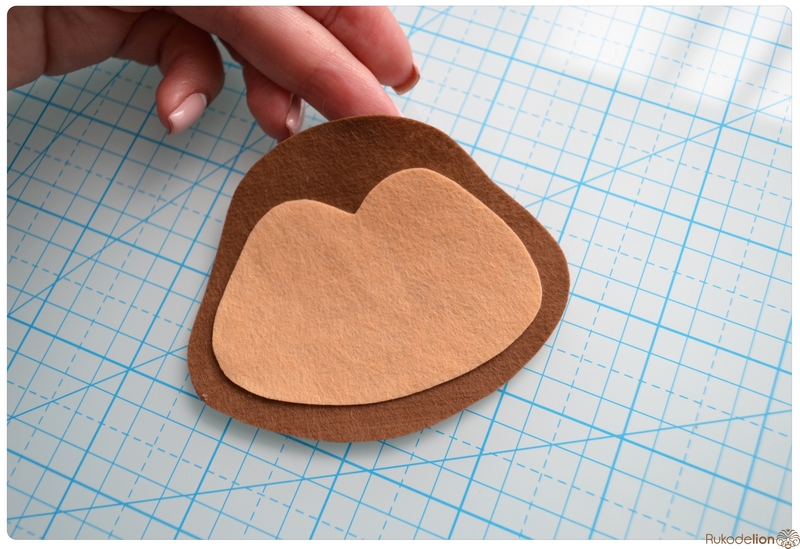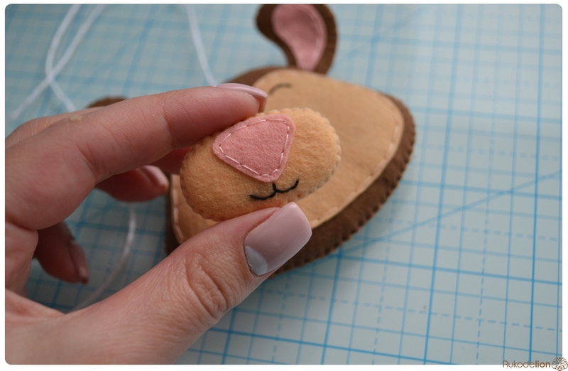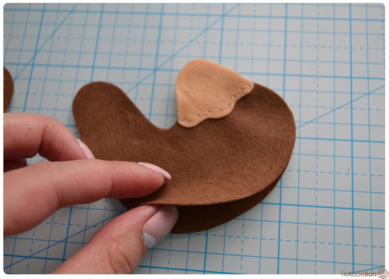 Прикладываем розовые детали ушек к коричневым и носик к мордочке
