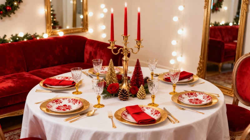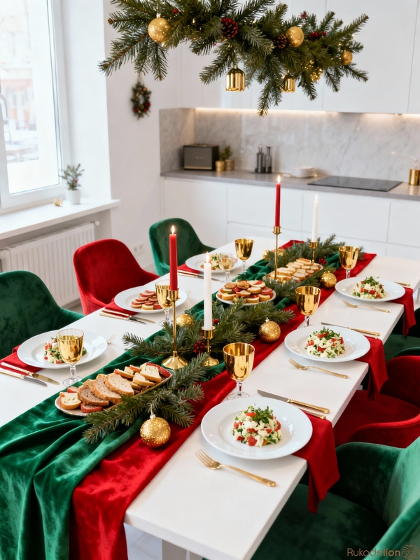Красно-зелено-золотая гамма — классика, наполненная теплом и блеском. Золотые акценты в посуде или свечах добавляют торжественности