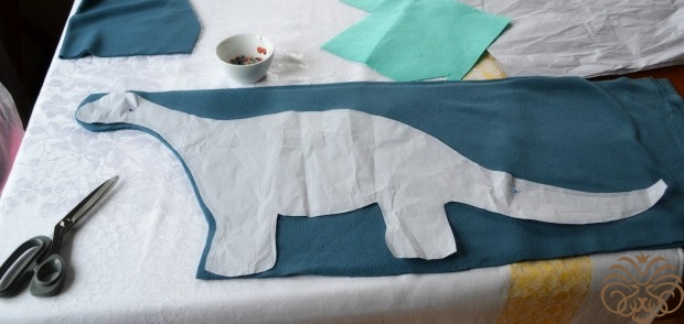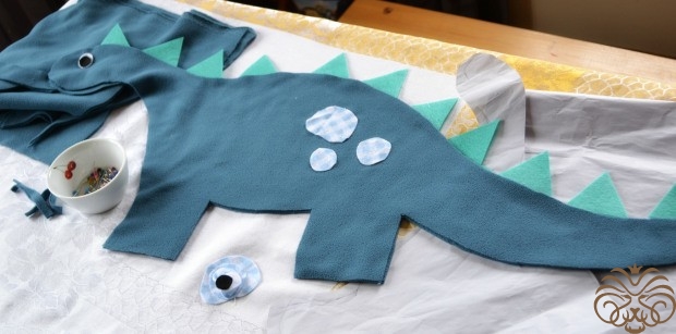 После того как вы вырезали все необходимые элементы, необходимо пришить глазки и пятна к правой стороне каждой выкройки. Затем к выкройкам (к правым сторонам) равномерно по всей длине тела динозаврика прикрепите с помощью иголок шипы. После того как вы скрепили все элементы, необходимо сшить игрушку. Не забываем оставить небольшое отверстие в животе динозаврика между ног для его наполнения. {img2}Далее аккуратно выворачиваем игрушку на лицевую сторону, расправляя углы с помощью вязальных спиц. Наполняем игрушку и зашиваем отверстие.