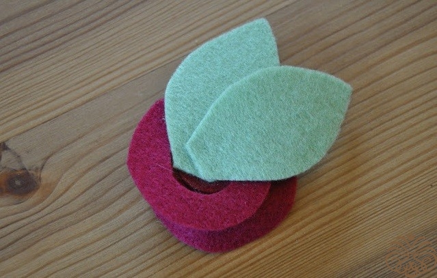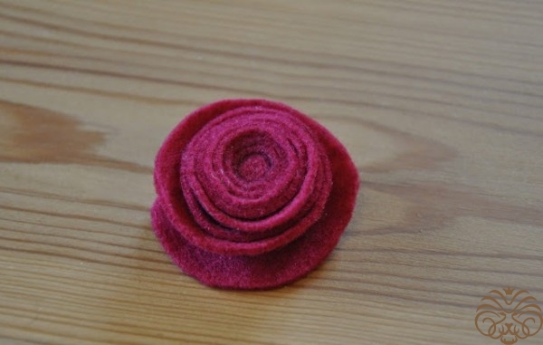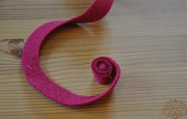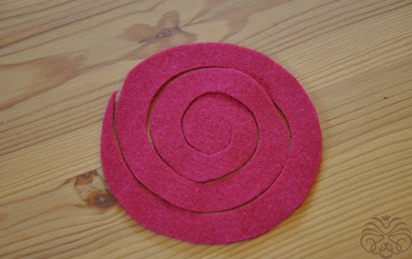 Далее на малиновом войлоке рисуем круг и вырезаем свиток (как показано на картинке). Закручиваем войлок из внешней стороны во внутрь, чтобы получился цветок.