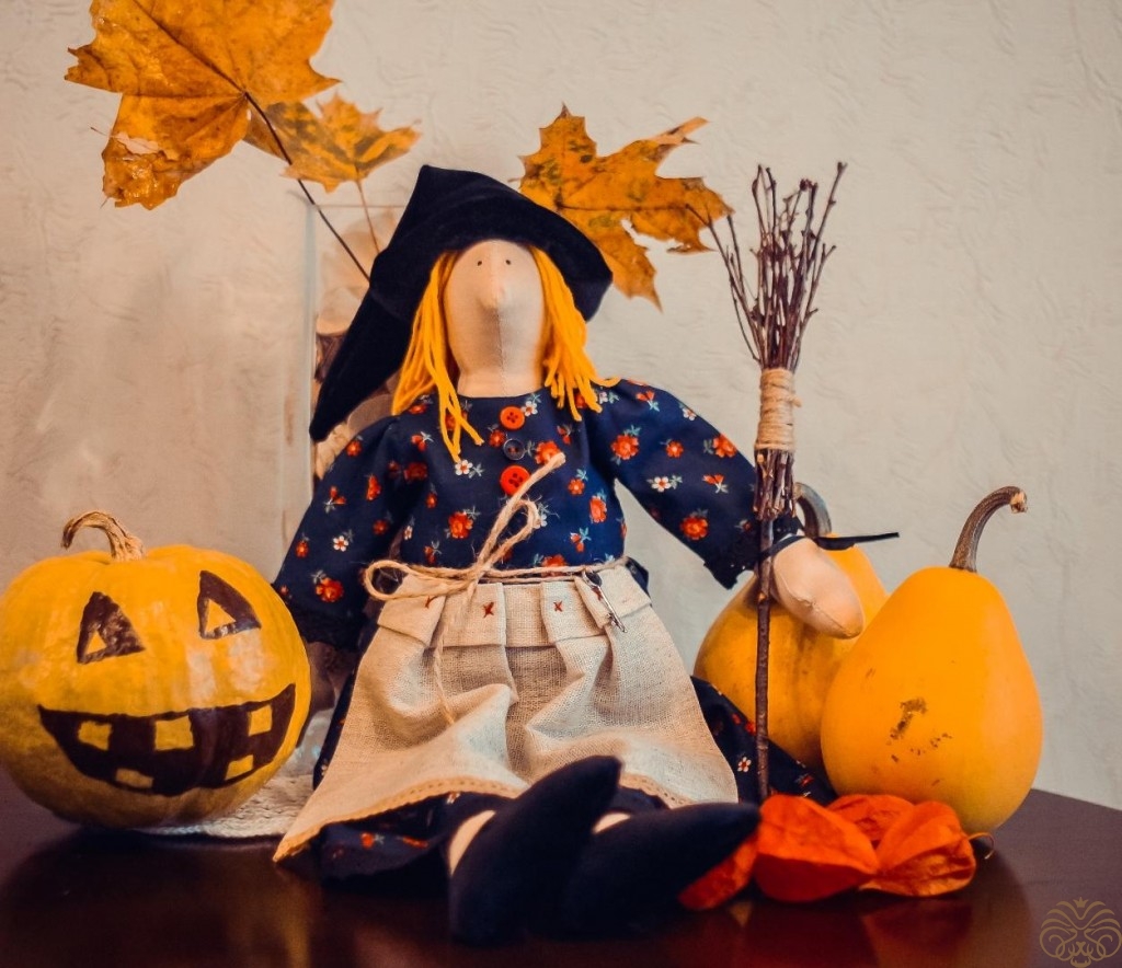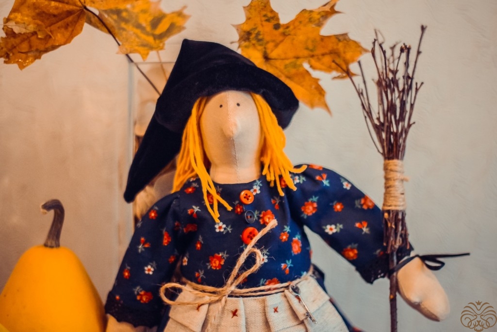 Текстильная кукла-ведьма Гретта, сделанная в преддверии Хеллоуина.