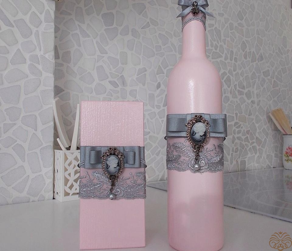 Подсвечник и бутылка украшены кружевом, камеями, стразами и летами