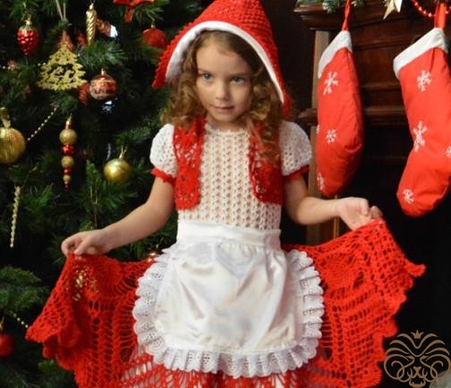 Новогодний костюм "Красная шапочка" связан крючком, пряжа "Сосо". Фартук ткань Стрейч-сатин и кружево