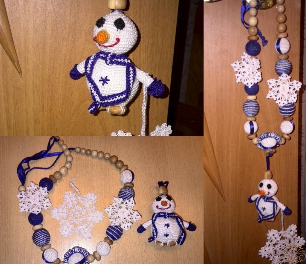 Слингобусы со съемным снеговиком. Можжевеловые бусины, хлопковая нить