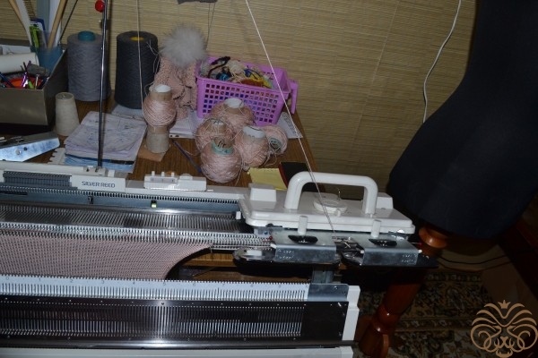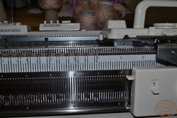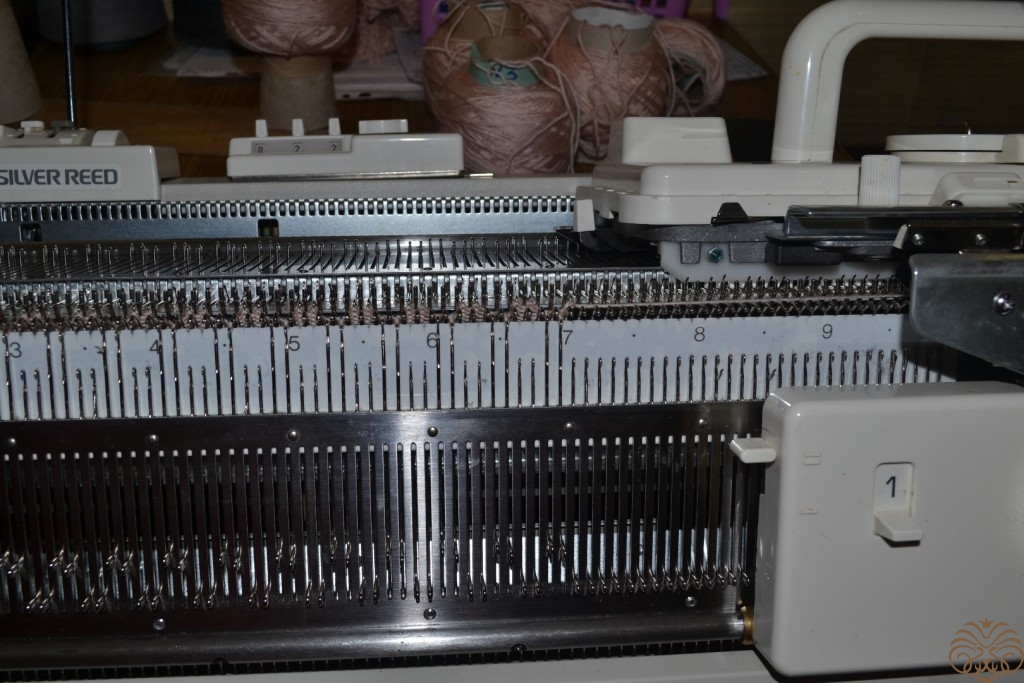 2. Отборной гребенкой включаем в работу иглы через две, поочередно на двух фонтурах в шахматном порядке 180 игл (90-0-90). Сдвигаем рычаг полушага на R-4, получаем разбор со смещением. Проходим один ряд направо, навесили большой грузодержатель со спицей и 5 больших грузов. Устанавливаем ручку выбора узора (РВУ) на S. Левый установочный рычаг (ЛУР) на 0. Левый боковой рычаг на треугольник. Проходим 2 ряда. РВУ на 0, ЛУР на 1, боковой рычаг на каретке опускаем в низ. Рычаг полушага обратно на R-5. Проходим соединительный ряд на плотности 1/1. Постепенно прибавляем плотность до 3/3. Вяжем 34 ряда.