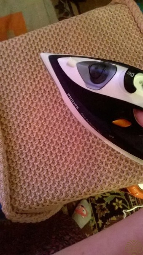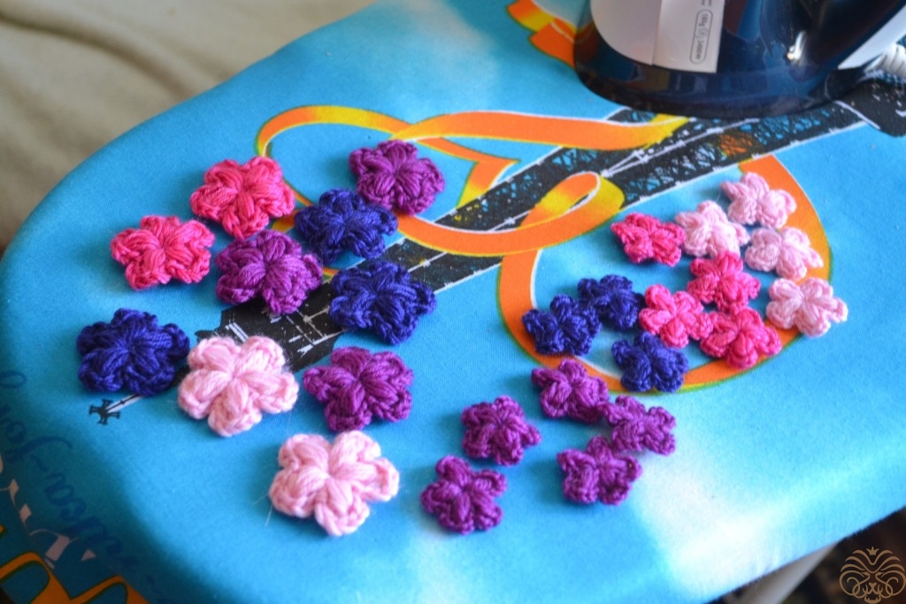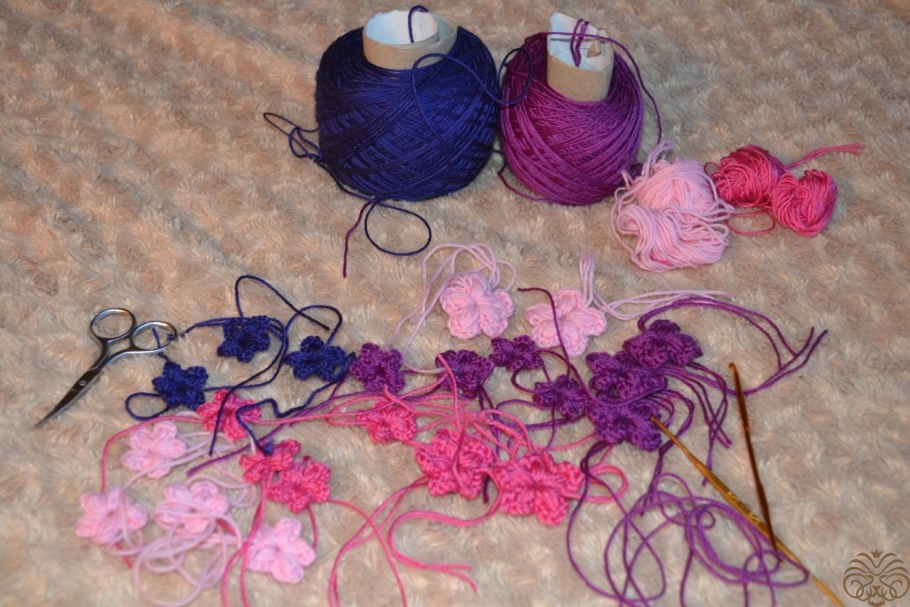 5. Вяжем цветочки крючком большие и маленькие в одну и две нитки, отпариваем (Смотри схему В. Вяжем 5 воздушных петель,замыкаем в кольцо, 3 петли подъема, пышный столбик,снова три воздушных петли, присоединяем к кольцу. Таким образом вяжем 5 лепестков)