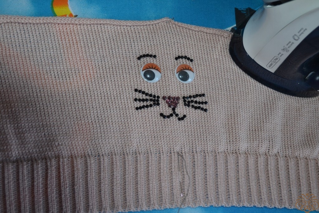 3. Выкладываем мордочку на шапочке стразами, приклеиваем утюгом, через тряпочку,