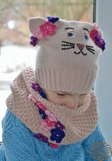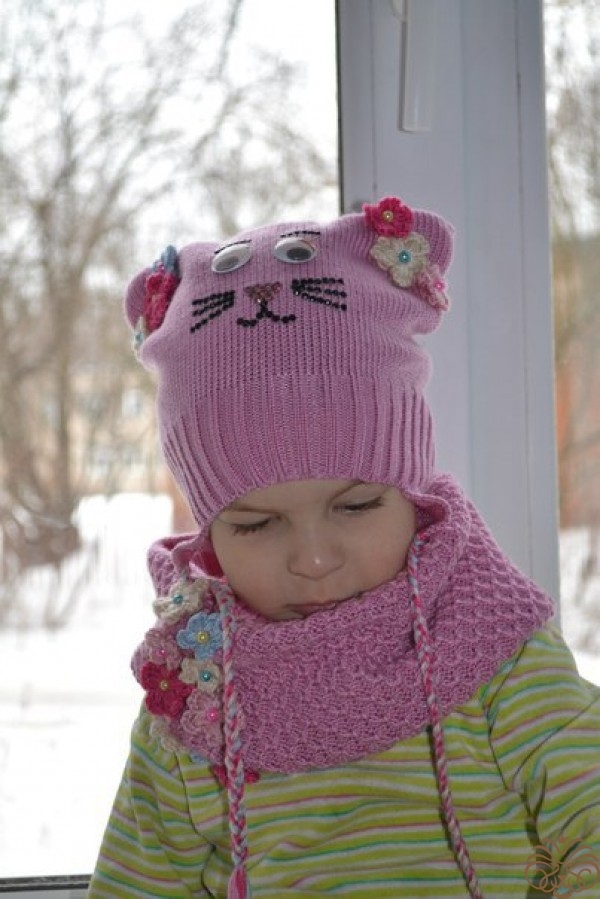 6. Сшиваем снуд, сшивает шапочку в виде квадрата. В углы вставляем синтепон, прошивает и чуть стягиваем шов чтоб получилось ушко.