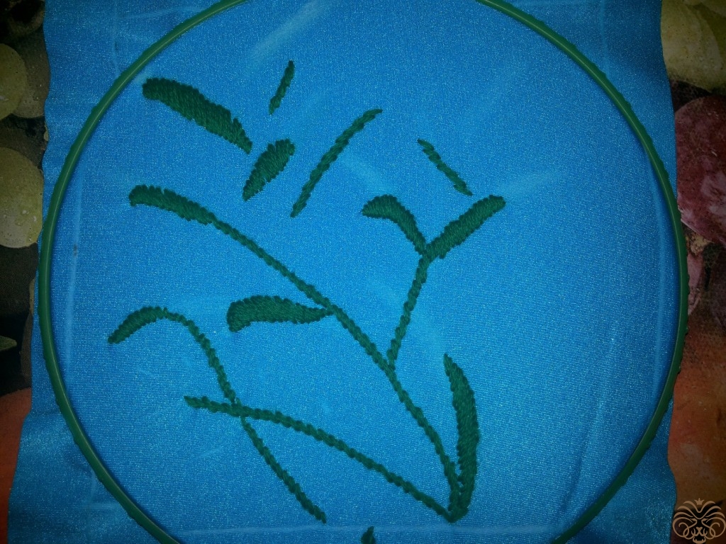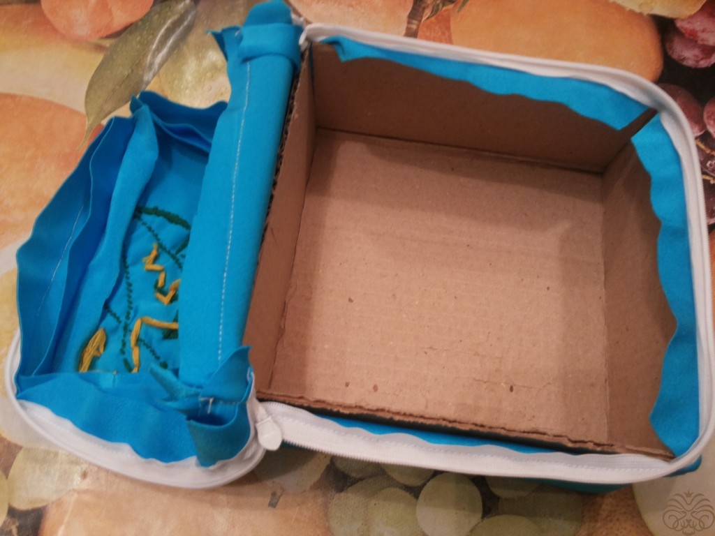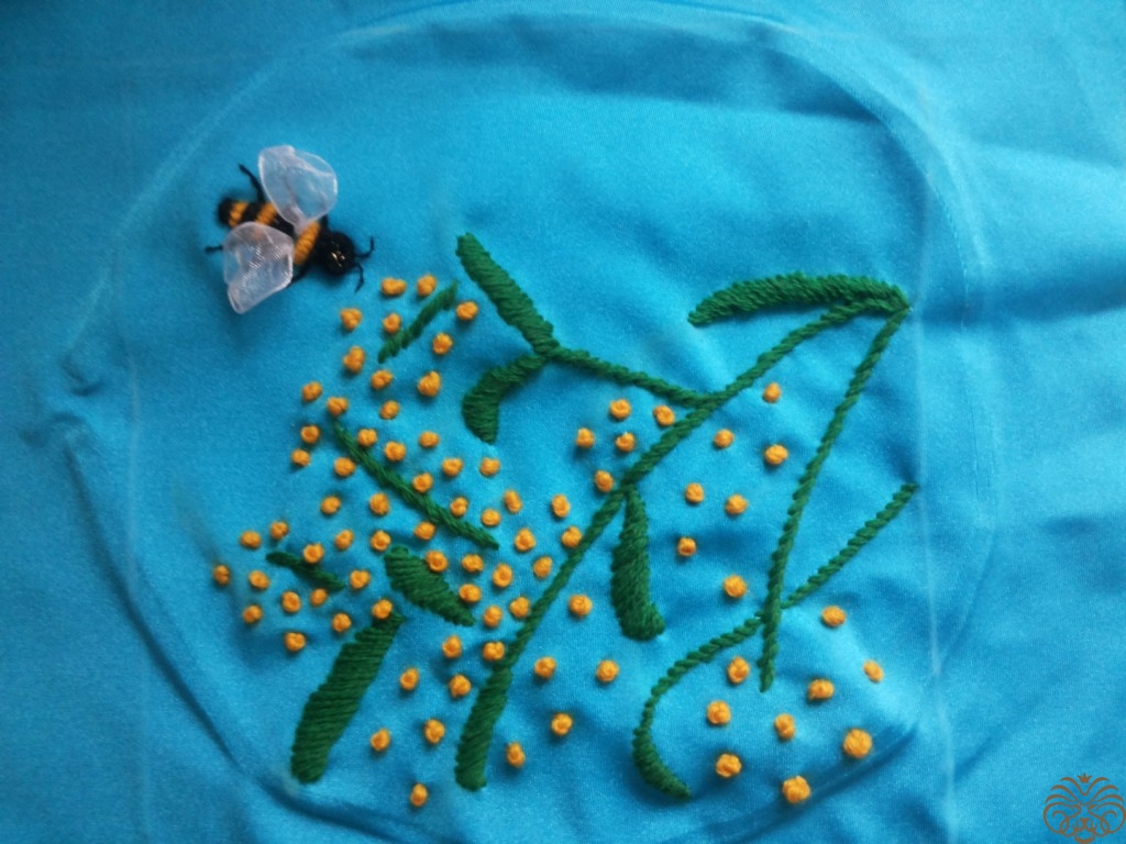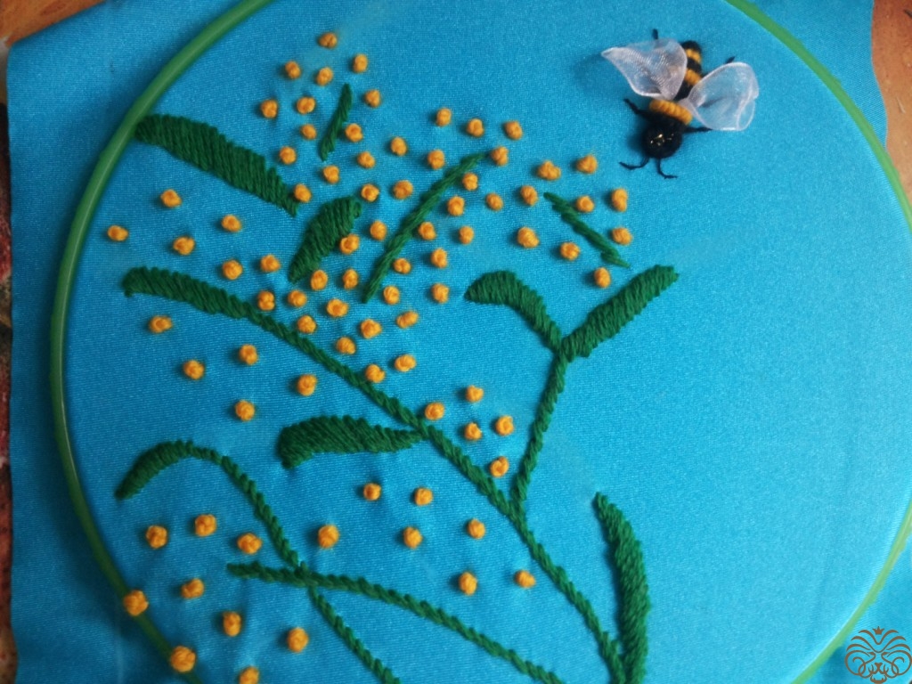Вышиваем верх шкатулки. Рисуем узор на ткани мелком, вышиваем шерстяными нитками, стебли и листья стебельчатым швом, цветочки французским узелком. Глазки пчелки вышиваем французским узелком, тельце выполняем узелком рококо, чередуя цвета черного и желтого. На вышитом тельце и глазках пчелки золотой нитью делаем блики. Ножки вышиваем в одну нить. Крылья из прозрачной ленты.