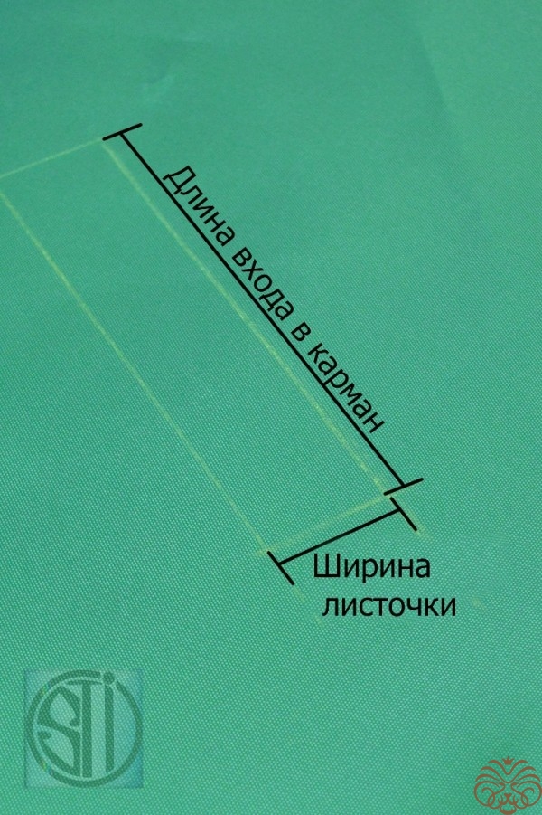 - Намечаем вход в карман. Длина кармана - это величина при которой удобно пользоваться карманом. Ширина листочки выбирается также индивидуально, в зависимости от модели. На данном примере длина входа в карман 12см, ширина 2,5мм.