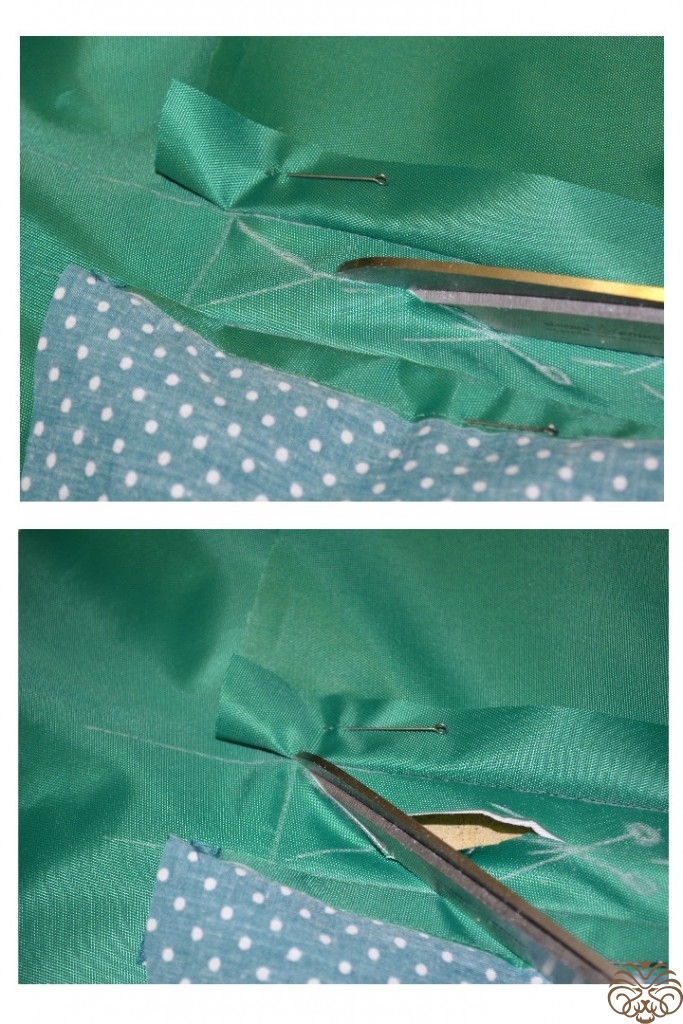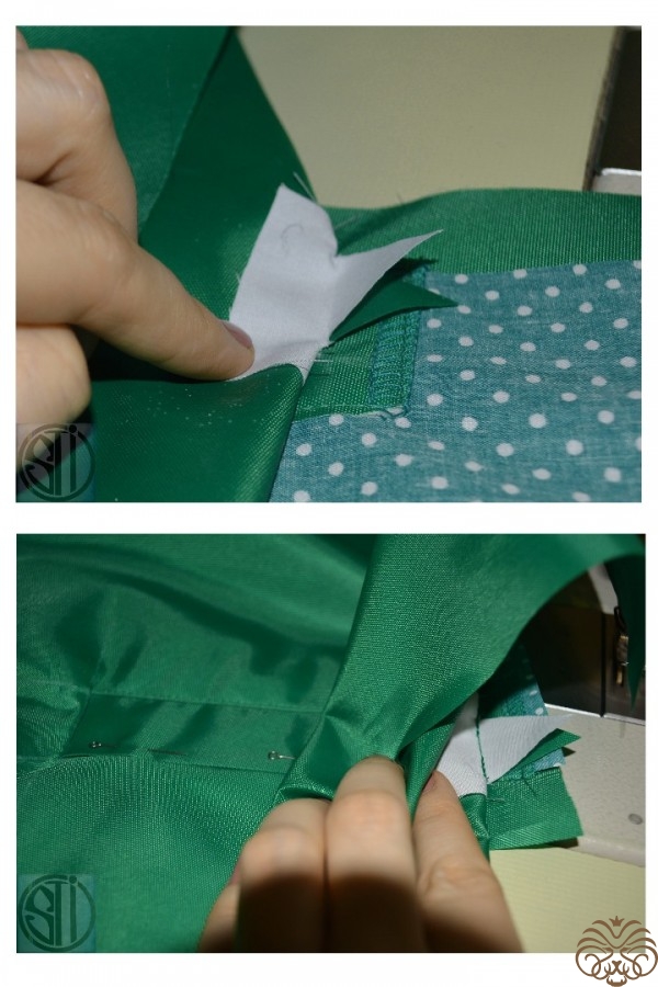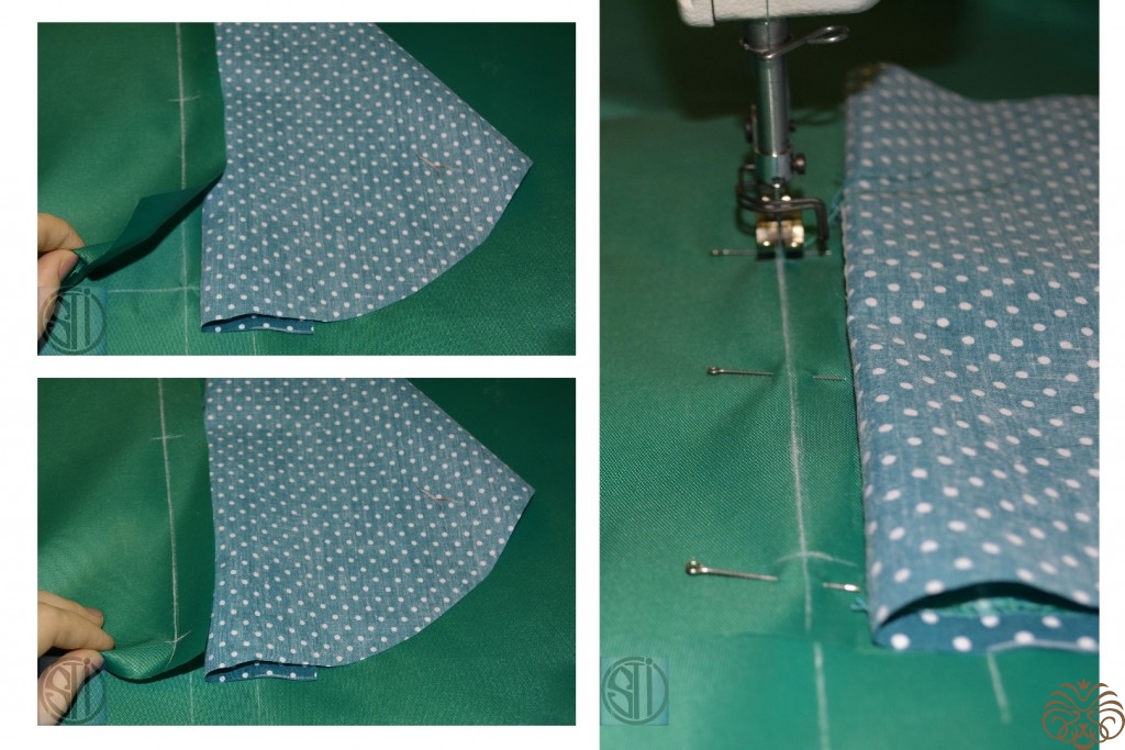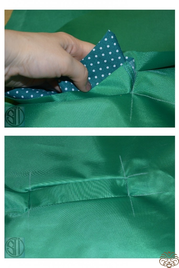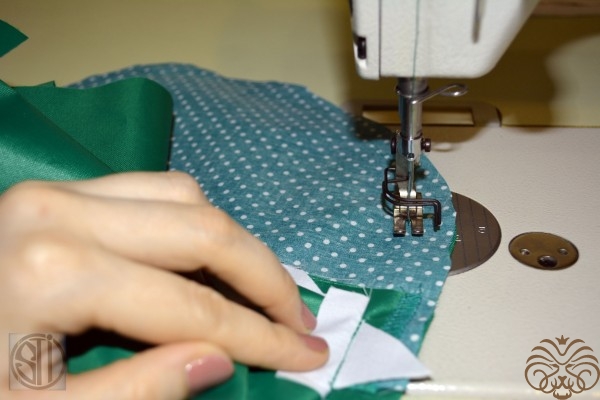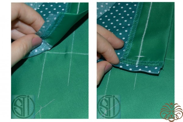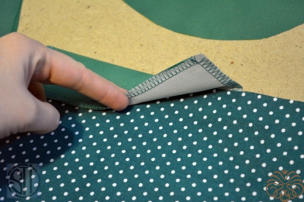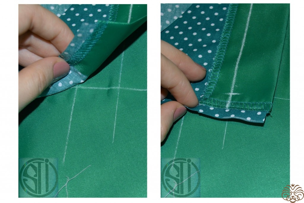 - с изнаночной стороны хорошенько поправляем уголочки, и очень аккуратно закрепляем, не забывая ставить закрепки в начале и конце строчки, а также наблюдаем за тем, чтобы не было наплывов и пустот в уголочках строчки!