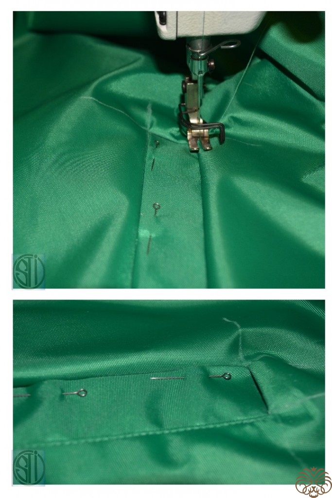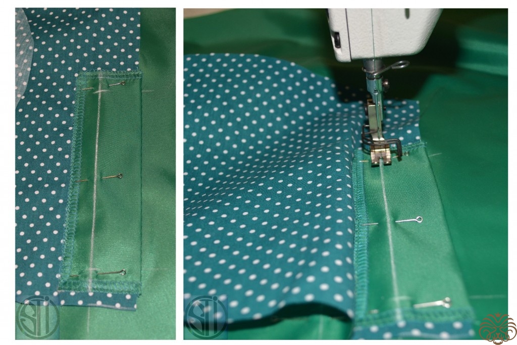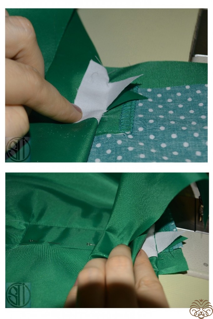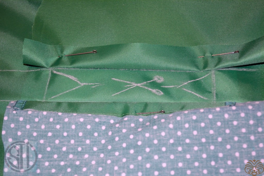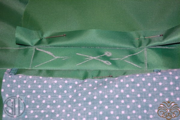 - приложить листочку с подкладкой на лицевую сторону изделия, совмещая "крестик" на листочки с "крестиком" на изделии на нижнюю линию входа в карман. Приметать или закрепить иголочками, чтобы избежать сдвига детали.