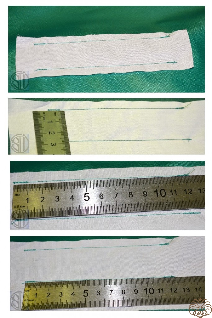 - Измеряем ширину и длину получившихся строчек. Длина должна быть четко одинаковая, а также уровень строчек должен вас удовлетворять, чтобы на лицевой стороне получился прямоугольник именно с прямыми углами. Также проверим ширину между строчек в начале, в середине и в конце и сравним с шириной листочки. Они тоже должны совпадать, чтобы после того как разрежем избежать пустот или наплывала из листочки.