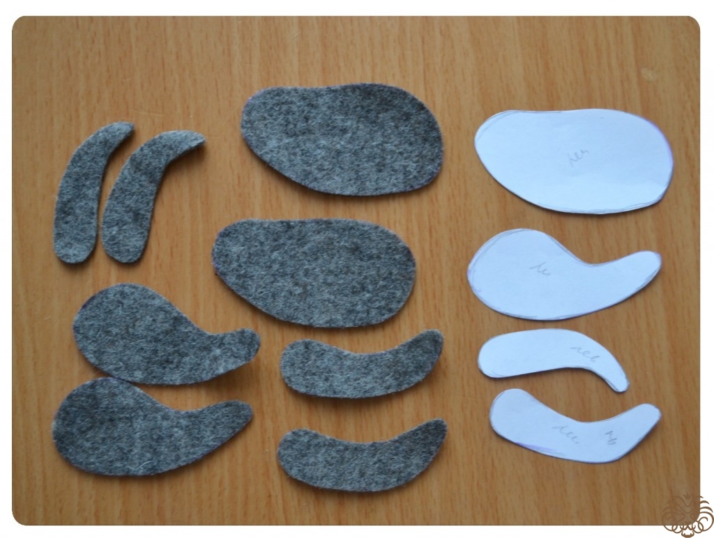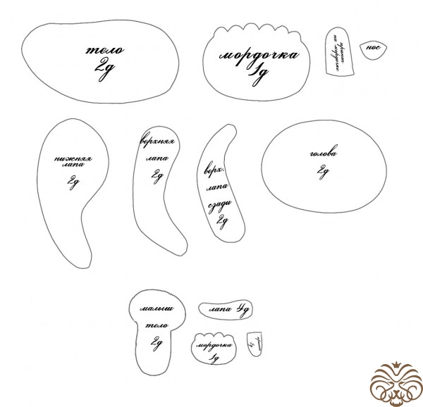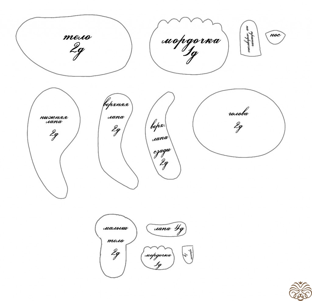 Таким образом мы обводим и вырезаем следующие детали: тело 2 детали, нижняя лапа 2 детали, верхняя передняя лапа 2 детали и верхняя задняя лапа 2 детали