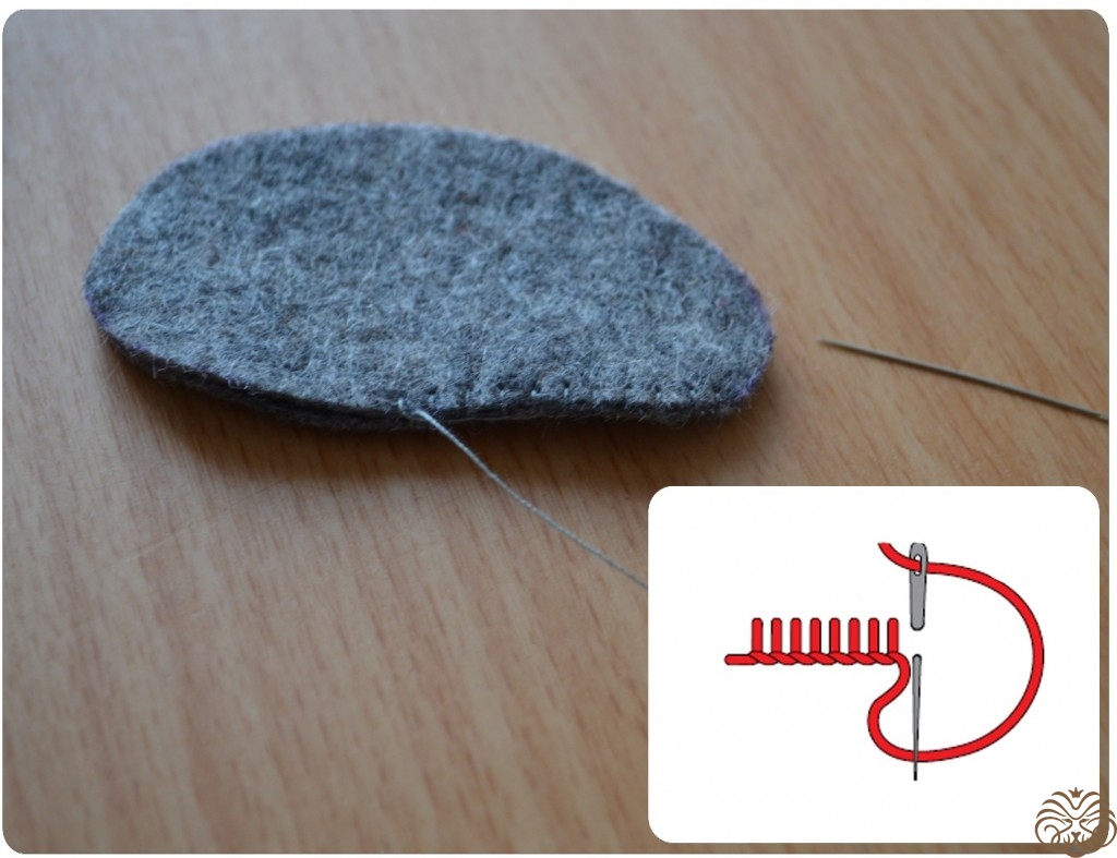 Начинаем сшивать детали. Берем две вырезанные детали тела ленивца и сшиваем их обметочным швом, как это показано на схеме в углу.
