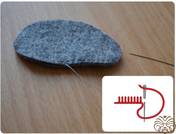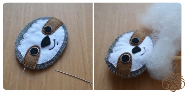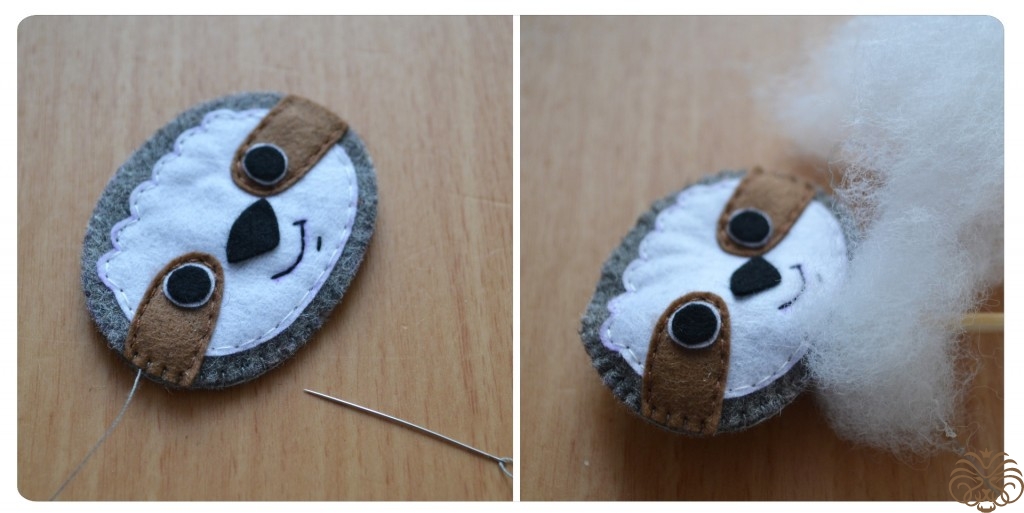 Сшиваем две детели головы ленивца обметочным швом, оставляем отверстие для набивки, набиваем голову синтепоном и заканчиваем обметочный шов