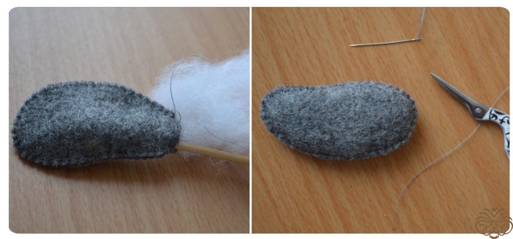 Оставляем небольшое отверстие для набивки. Набиваем тельце синтепоном. Для набивки я использую тупую сторону шпажки. Заканчиваем обметочный шов, завязываем узелок и обрезаем нить.