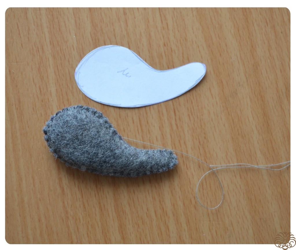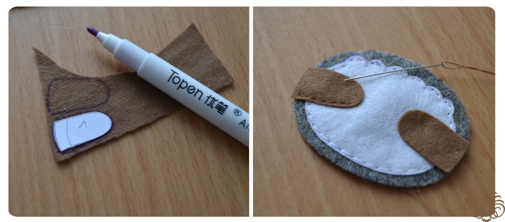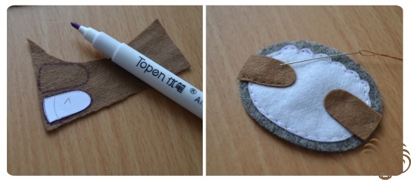 На коричневом фетре самоисчезающим маркером обводим принт для мордочки 2 раза. Вырезаем. Швом "назад иголка" пришиваем принт к голове