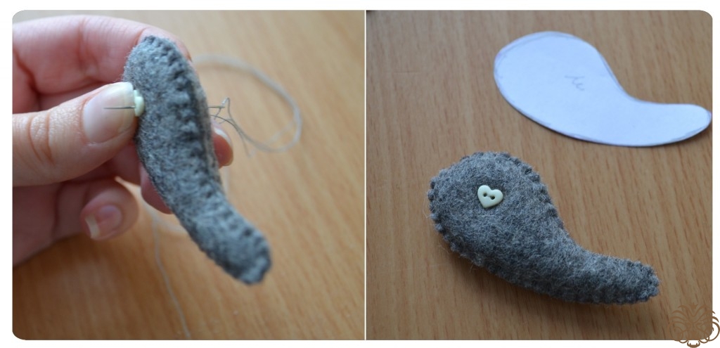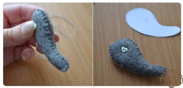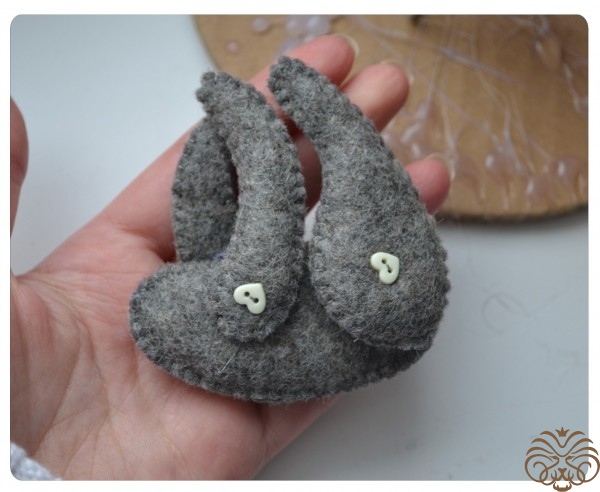 Не забудьте лапки переднего плана украсить декоративными пуговками. Для этого уже готовую лапку прошиваем насквозь и пришиваем пуговку, затягивая нить сзади, чтобы немного "утопить" пуговку. Верхнюю заднюю лапку мы не набиваем и не украшаем пуговкой