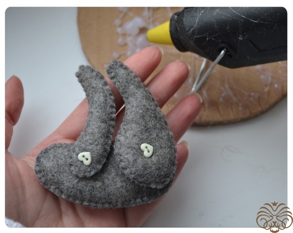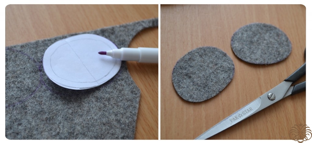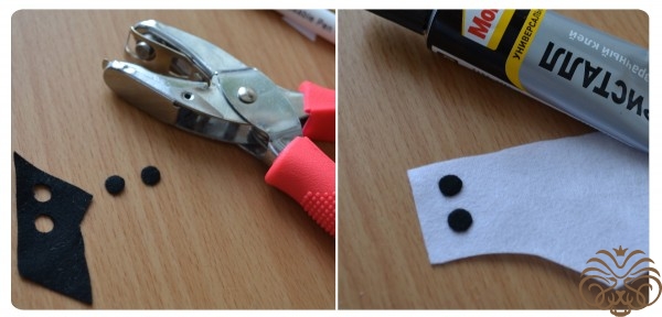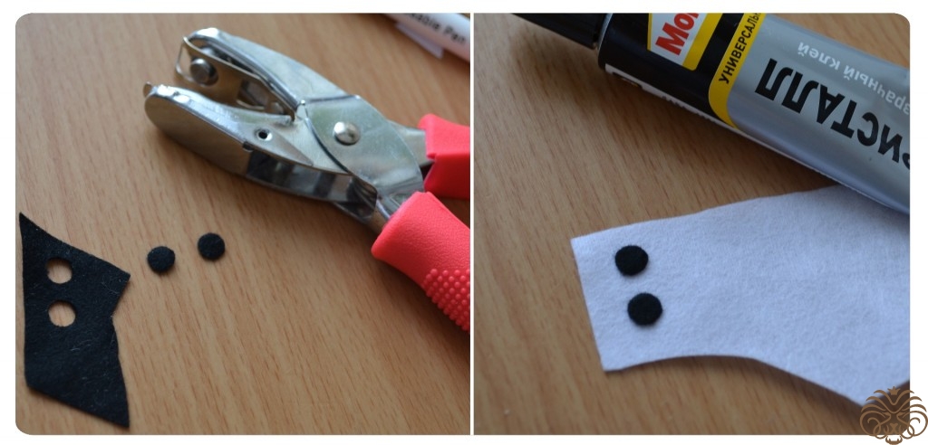 Дыроколом по фетру вырезаем два кружочка и приклеиваем их на белый фетр при помощи клея Момент Кристалл. Между кружочками должно быть небольшое расстояние.