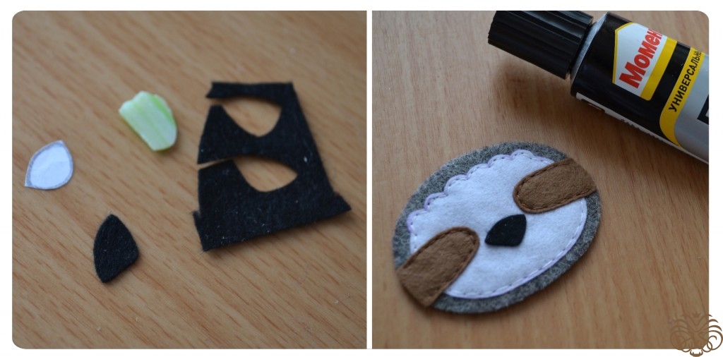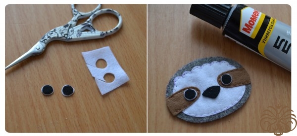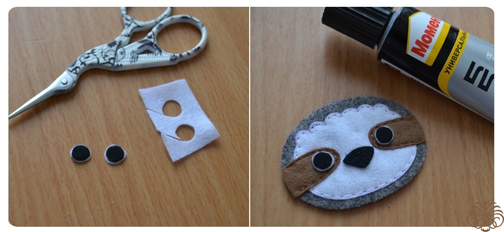 Маникюрными ножницами вырезаем из белого фетра черные кружочки, оставляя белую обводку вокруг черных кругов примерно 1-2 мм. Приклеиваем полученные глазки к мордочке ленивца при помощи клея Момент Кристалл