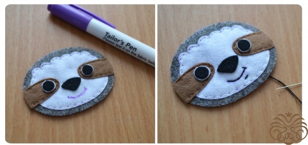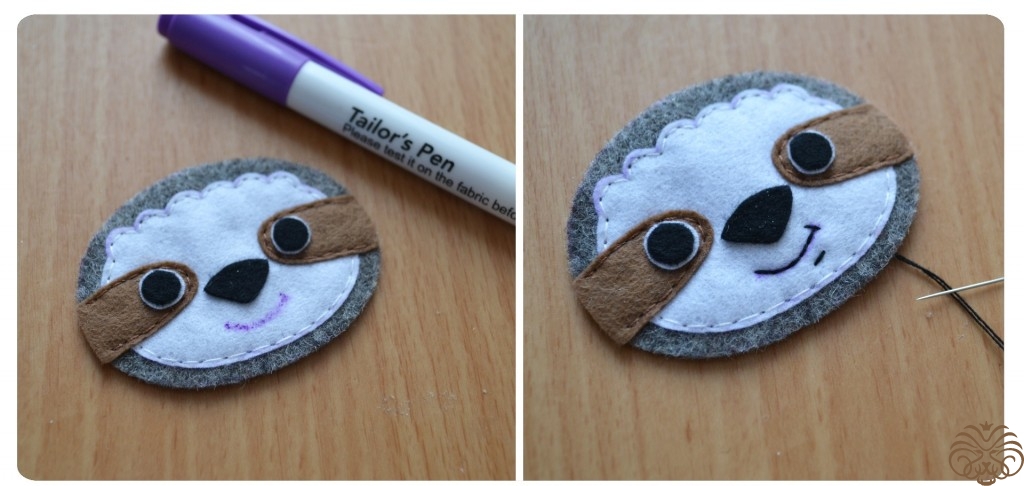 Самоисчезающим маркером нарисуем на мордочке будущие очертания улыбки ленивца и вышьем ее при помощи черных ниток швом "назад иголка". Для четкости линии лучше взять двойную нить