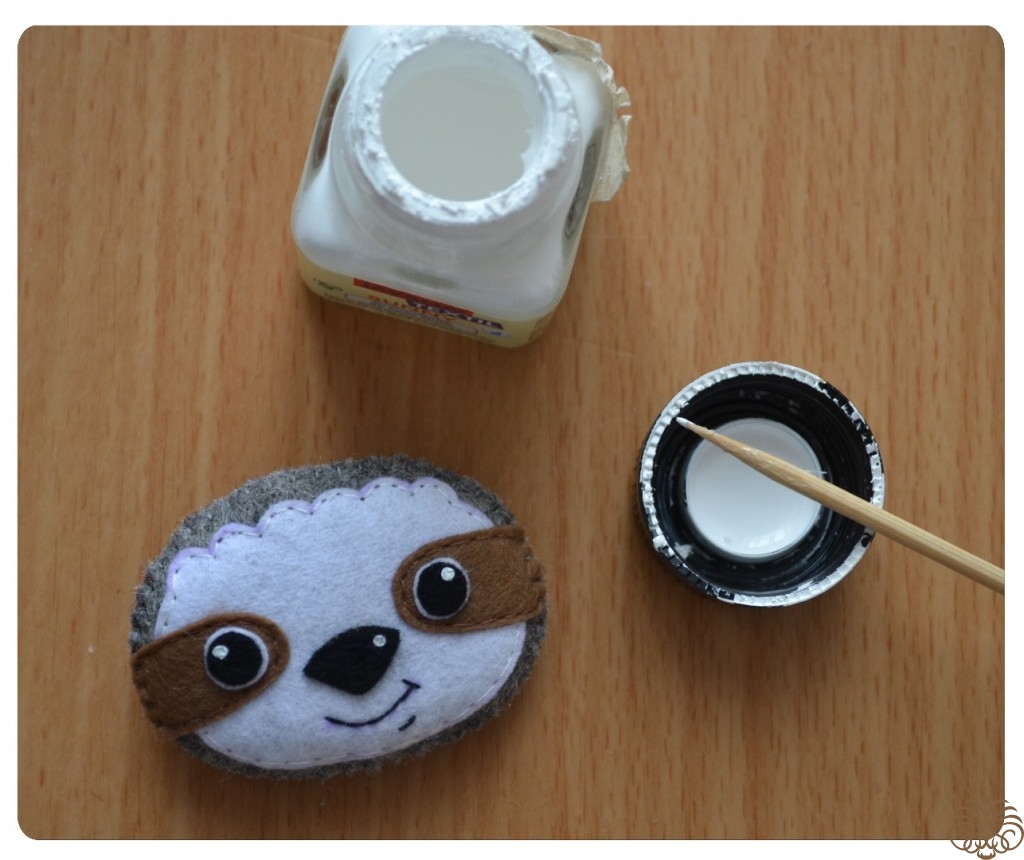 Белой краской по ткани нарисуем ленивцу блеск в глазах и на носике. Для удобства я использую острую сторону шпажки. Через некоторые время краска впитается в фетр и нужно будет нанести второй слой белой краски