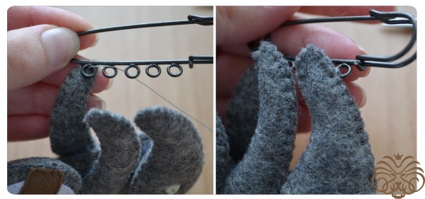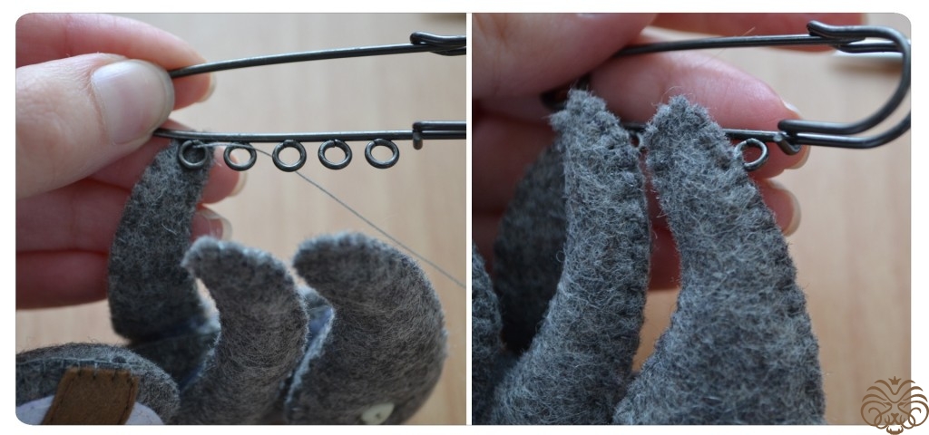 Теперь нам нужно пришить ленивца к булавочке. Я использую булавку с уже готовыми колечками для пришивания. Заднюю верхнюю лапу располагаем сзади колечка и пришиваем ее к нему, а передние верхнюю и нижнюю лапку располагаем спереди колечек и пришиваем их к ним