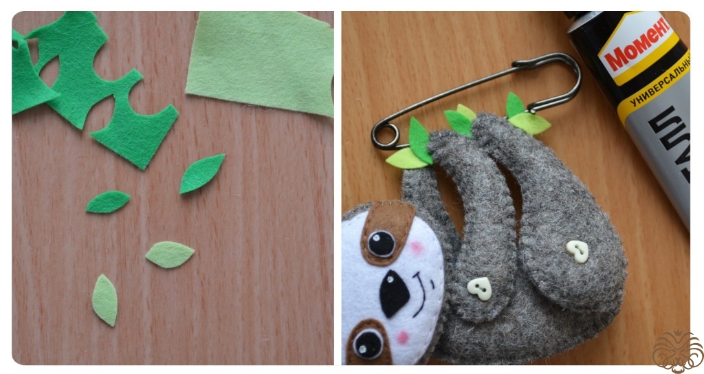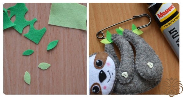 Теперь давайте прикроем оставшиеся видными колечки. Для этого нарезаем из зеленого и салатового фетра листочки произвольной формы и приклеим их при помощи клея Момент Кристалл под лапки ленивца. Внимание! Листики нужно приклеивать именно к ленивцу, т.е. к фетру, а не к металлическим частям булавки. Также румянами нарисуем щечки ленивцу. Наш ленивец готов