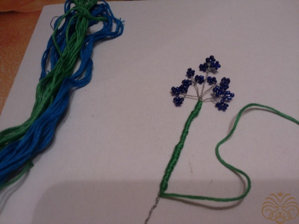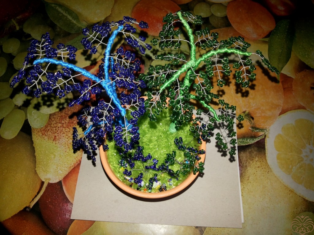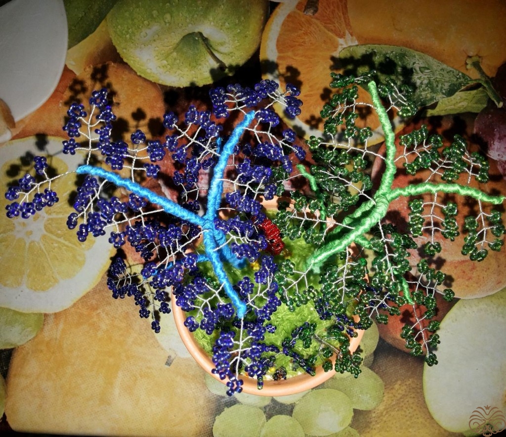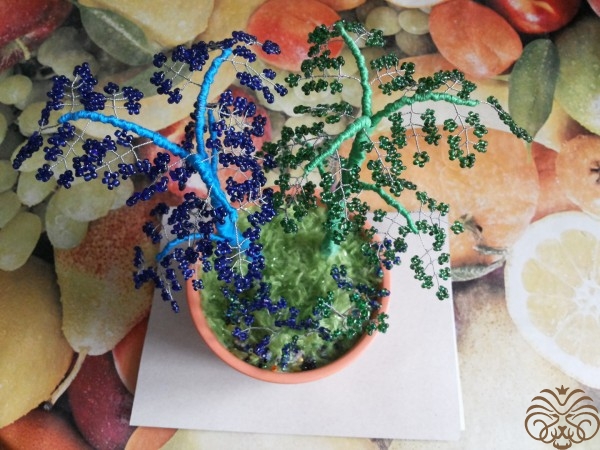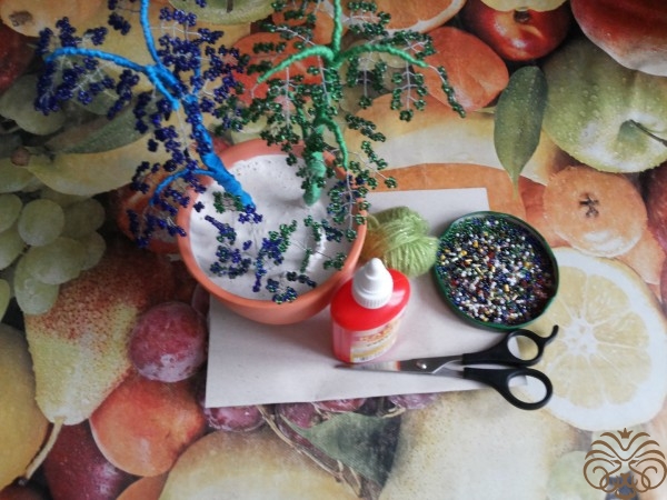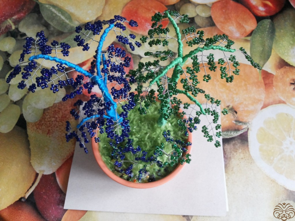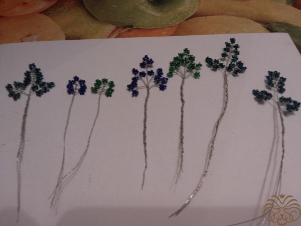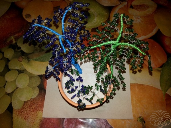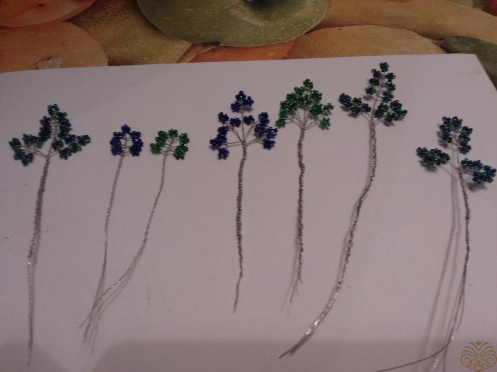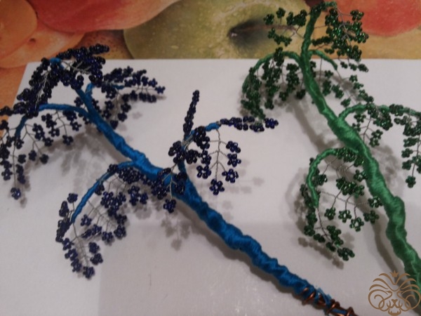 Берем проволоку и бисер. Начинаем плести веточки с листочками. На проволоку нанизываем по 5 или 6 бисерин. затем перекручиваем, таким образом формируя листок, количество листочков на веточке произвольное. После того как необходимое количество веточек сделано, скручиваем их между собой по 3-5 штук, создавая более большие ветви.