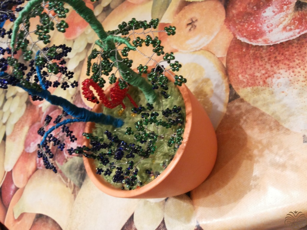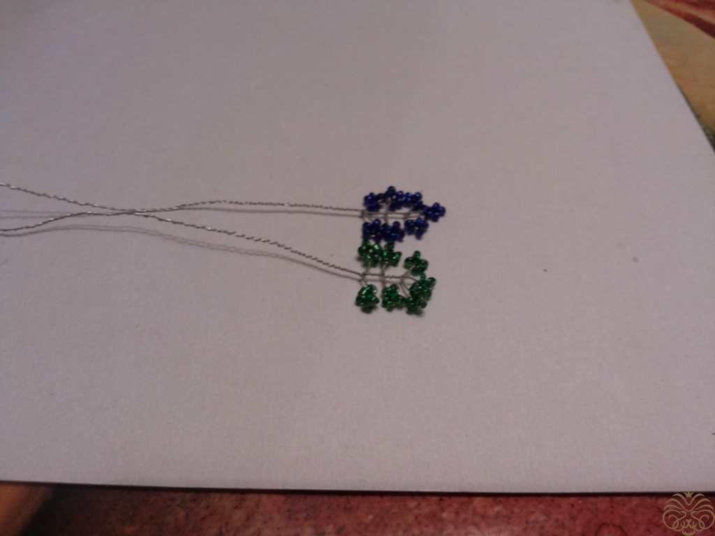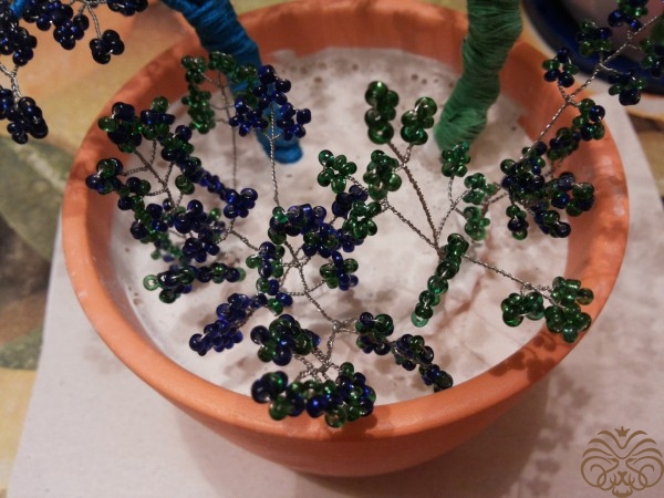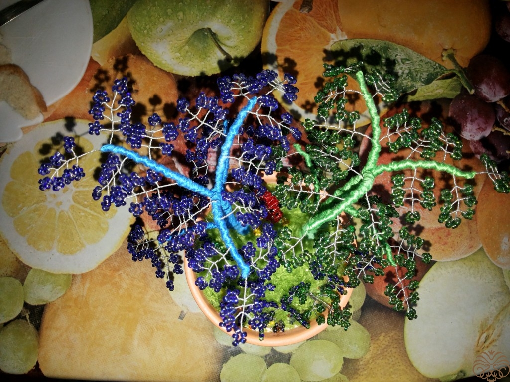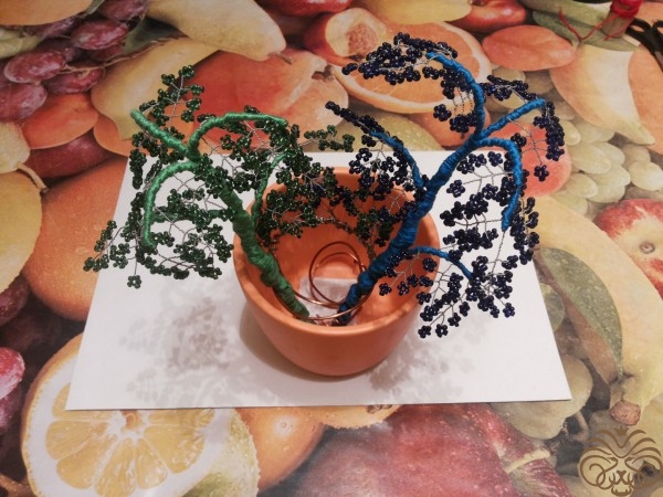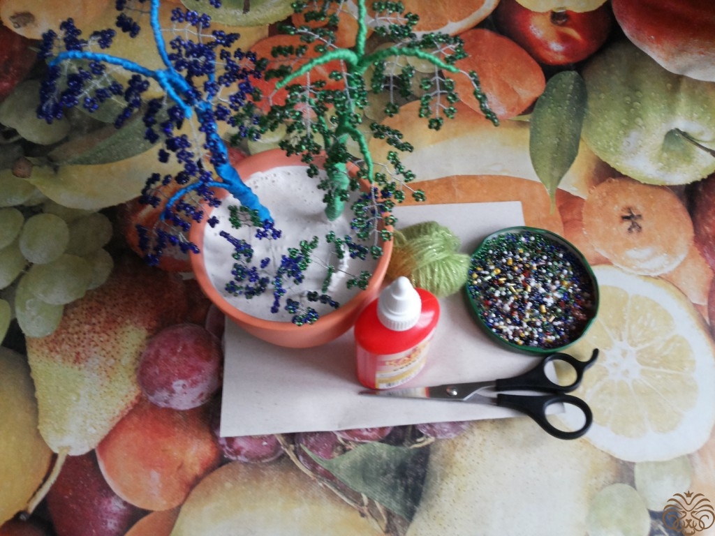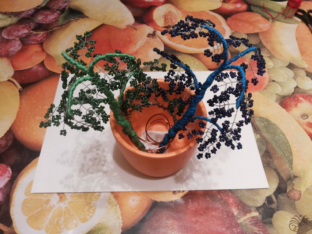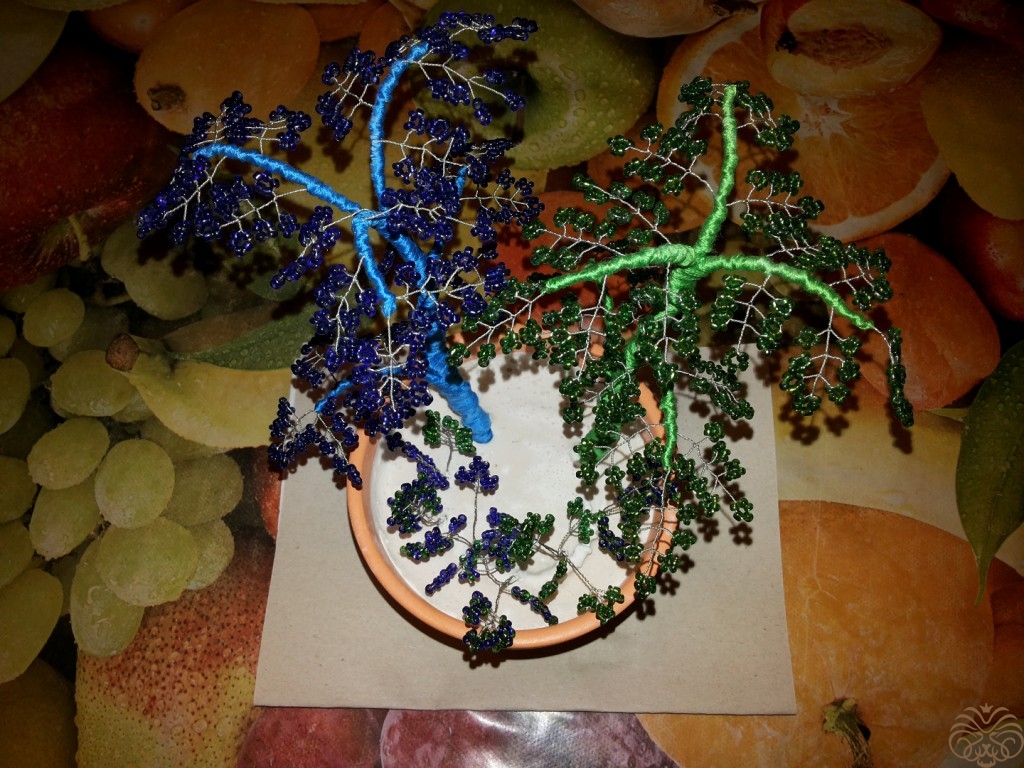 Берем проволоку и бисер. Начинаем плести веточки с листочками. На проволоку нанизываем по 5 или 6 бисерин. затем перекручиваем, таким образом формируя листок, количество листочков на веточке произвольное. После того как необходимое количество веточек сделано, скручиваем их между собой по 3-5 штук, создавая более большие ветви.