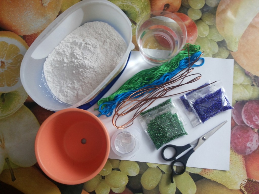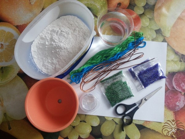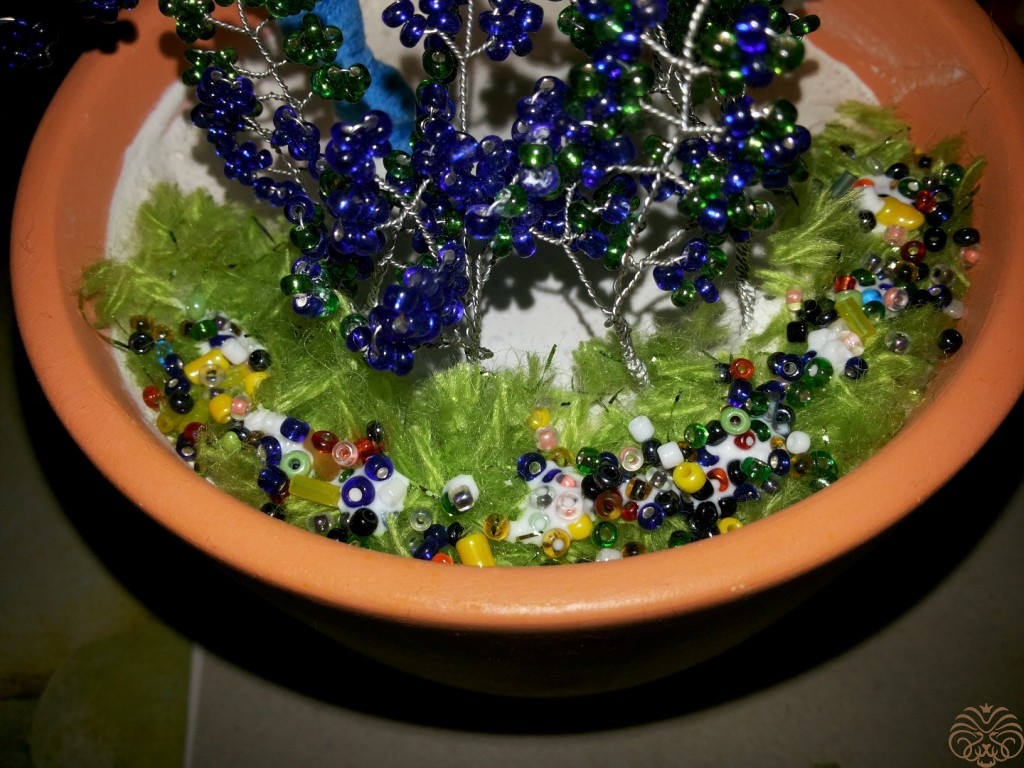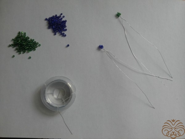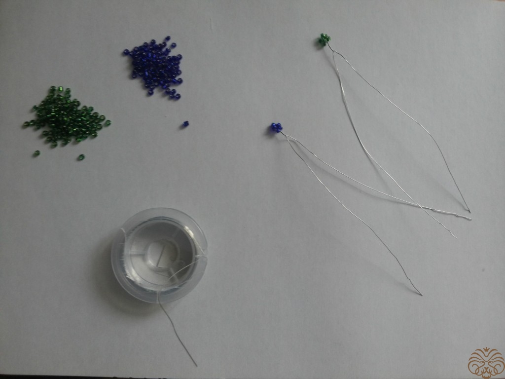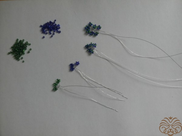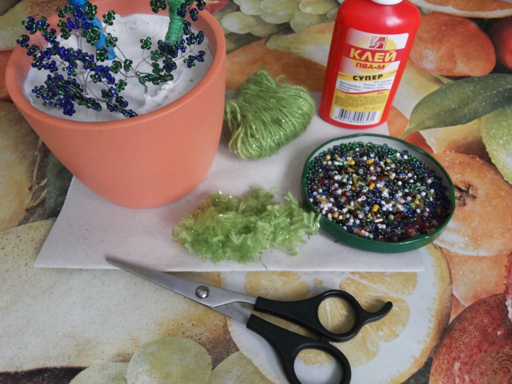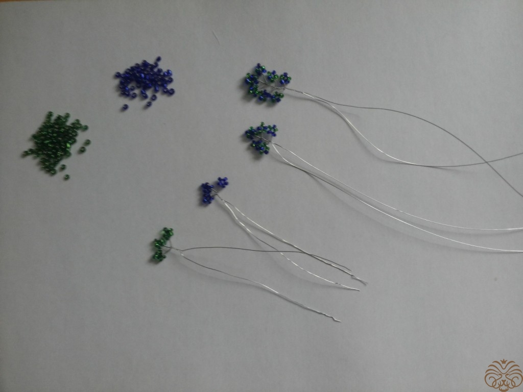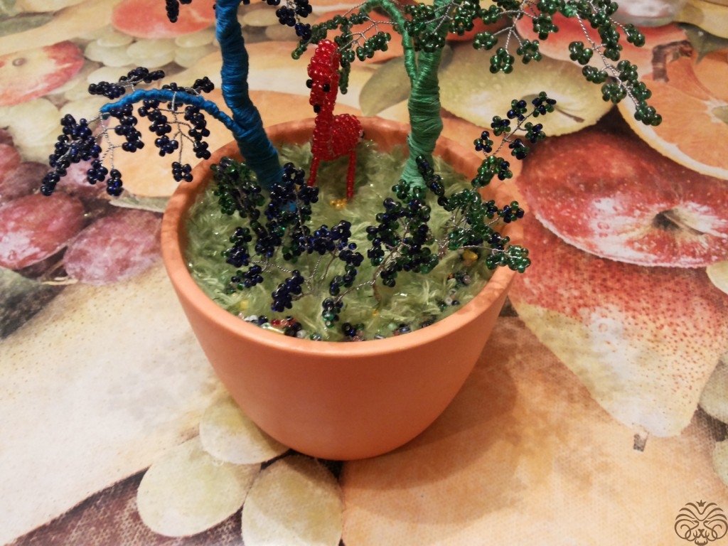 Берем проволоку и бисер. Начинаем плести веточки с листочками. На проволоку нанизываем по 5 или 6 бисерин. затем перекручиваем, таким образом формируя листок, количество листочков на веточке произвольное. После того как необходимое количество веточек сделано, скручиваем их между собой по 3-5 штук, создавая более большие ветви.