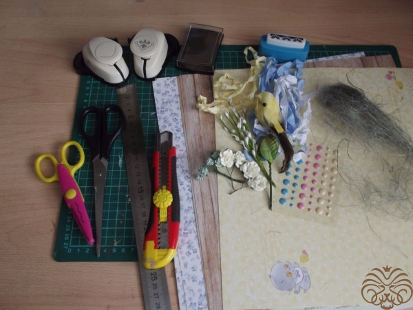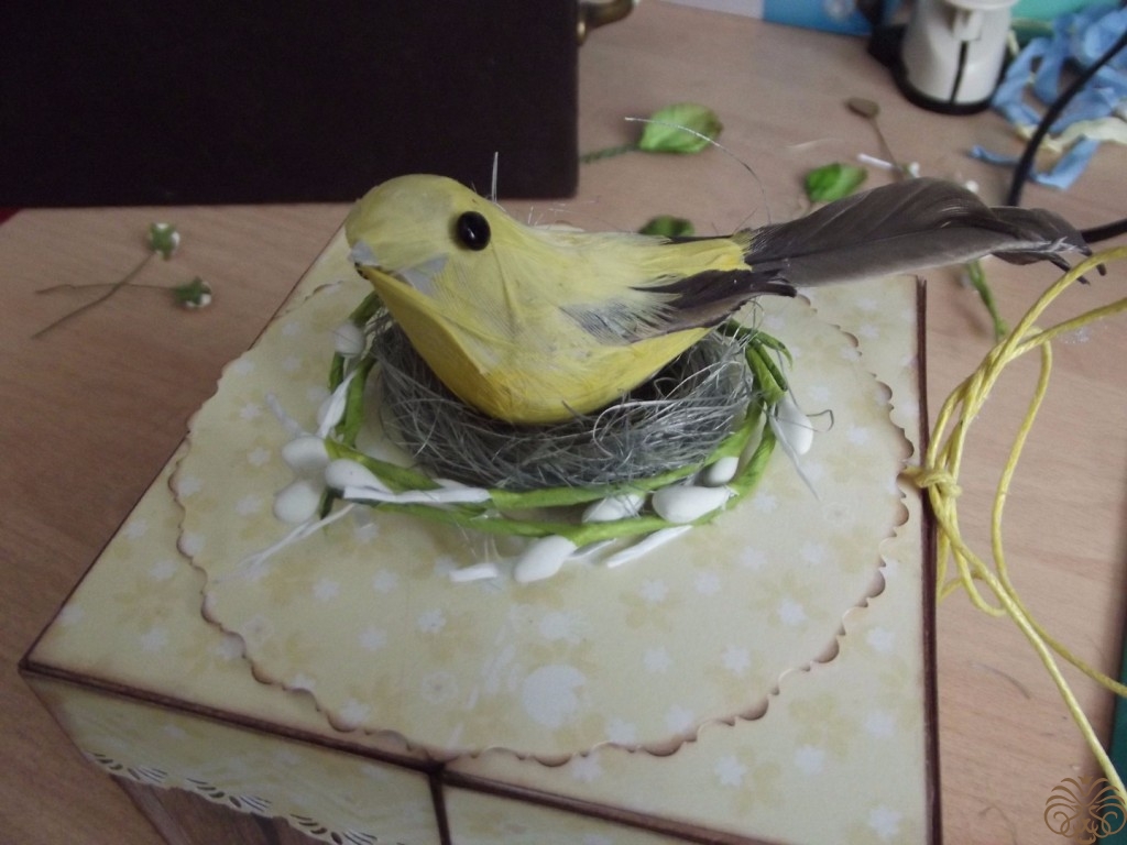 - украшалочки (шебби-ленточки, птичка, веточки искусственной вербы, бумажные листочки и цветы, сизалевое волокно);