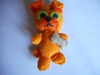 Я решила сделать всем животным по аксессуару в лапки. Для котика из голубой пряжи сматываем клубочек. Для мышки сделаем кусочек сыра. Для этого из желтого фетра по выкройке вырезаем две детали сыра. Сшиваем их обметочным швом, набиваем синтепоном. Из коричневого фетра вырезаем произвольной формы кругляшки (дырочки сыра) и приклеиваем их момент Кристаллом. Чтобы сделать морковку для зайки вырезаем две детали морковки из рыжего фетра. На одной из них швом "назад иголка" желтыми нитками нарисуем штрихи. К нижней рыжей детали приклеиваем вырезанную из зеленого фетра зеленушку  и сшиваем детали обметочным швом, набиваем синтепоном. Косточку для собаки вырезаем из белого фетра и обшиваем обметочным швом. Косточку я не стала набивать синтепоном