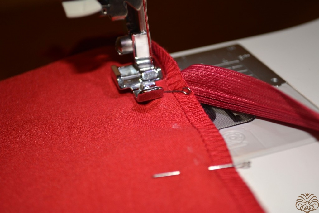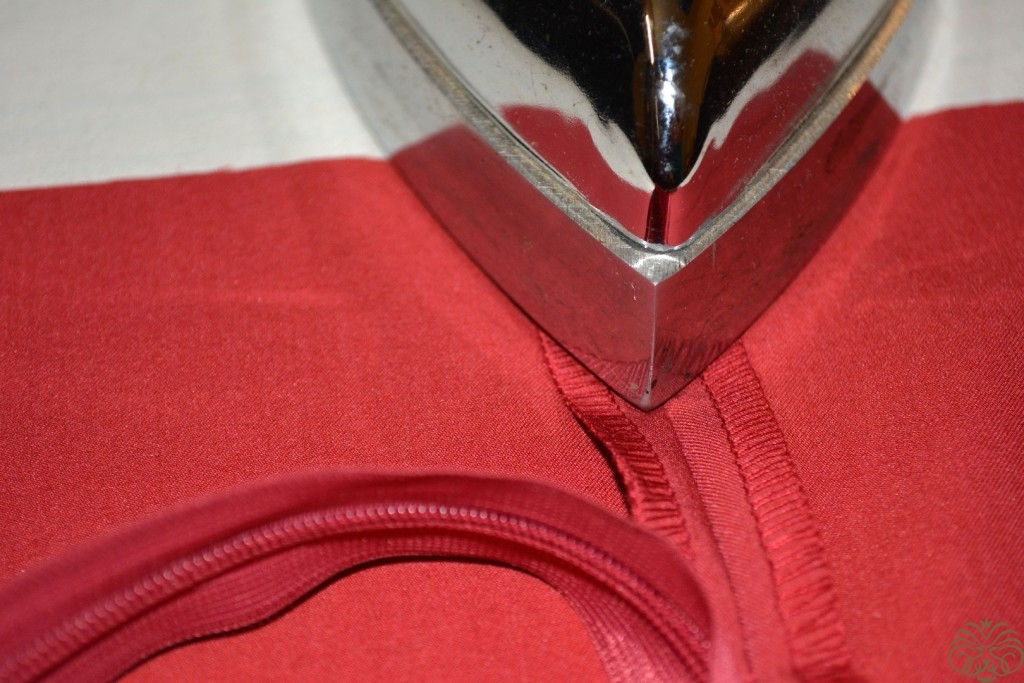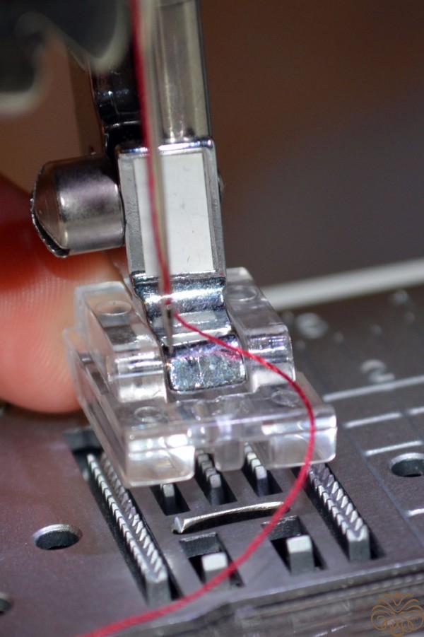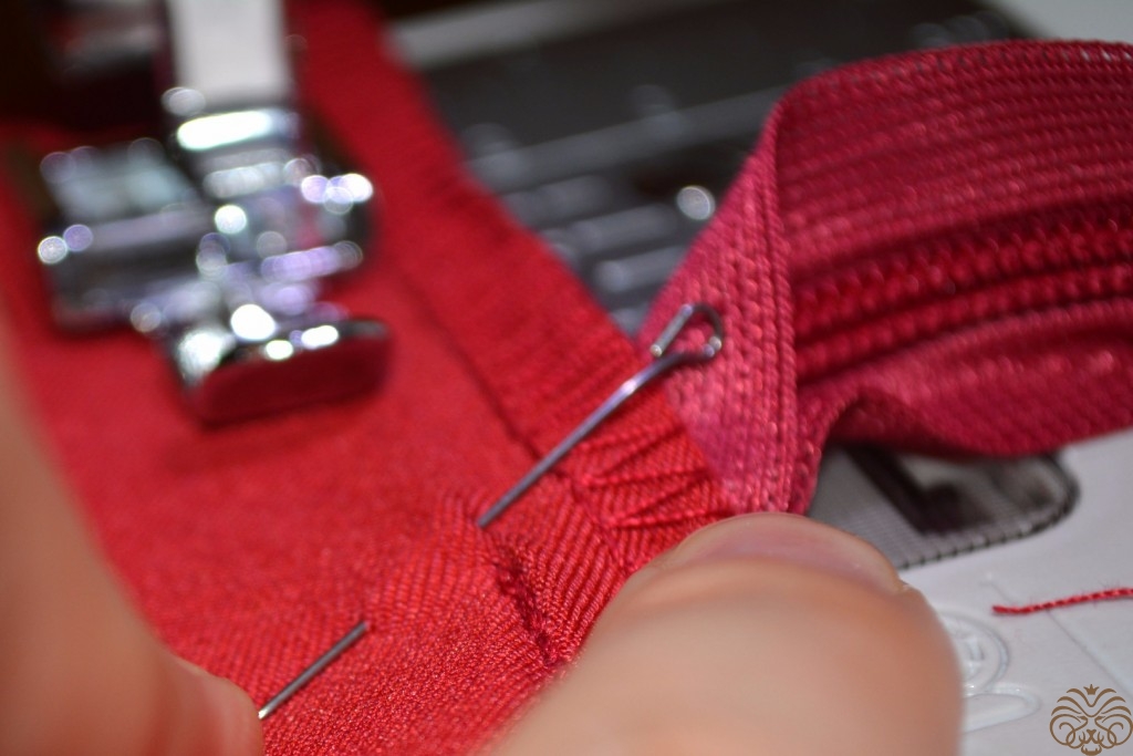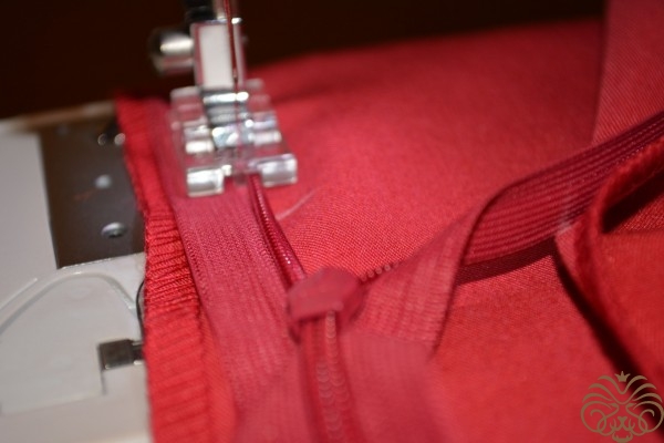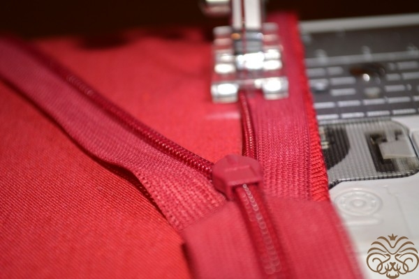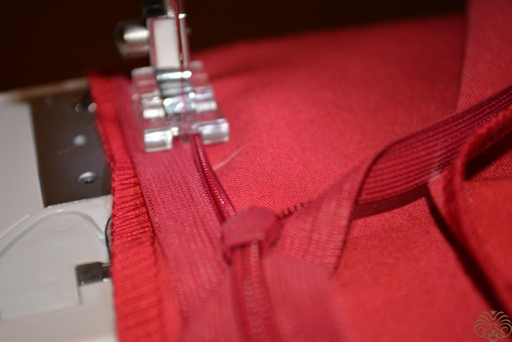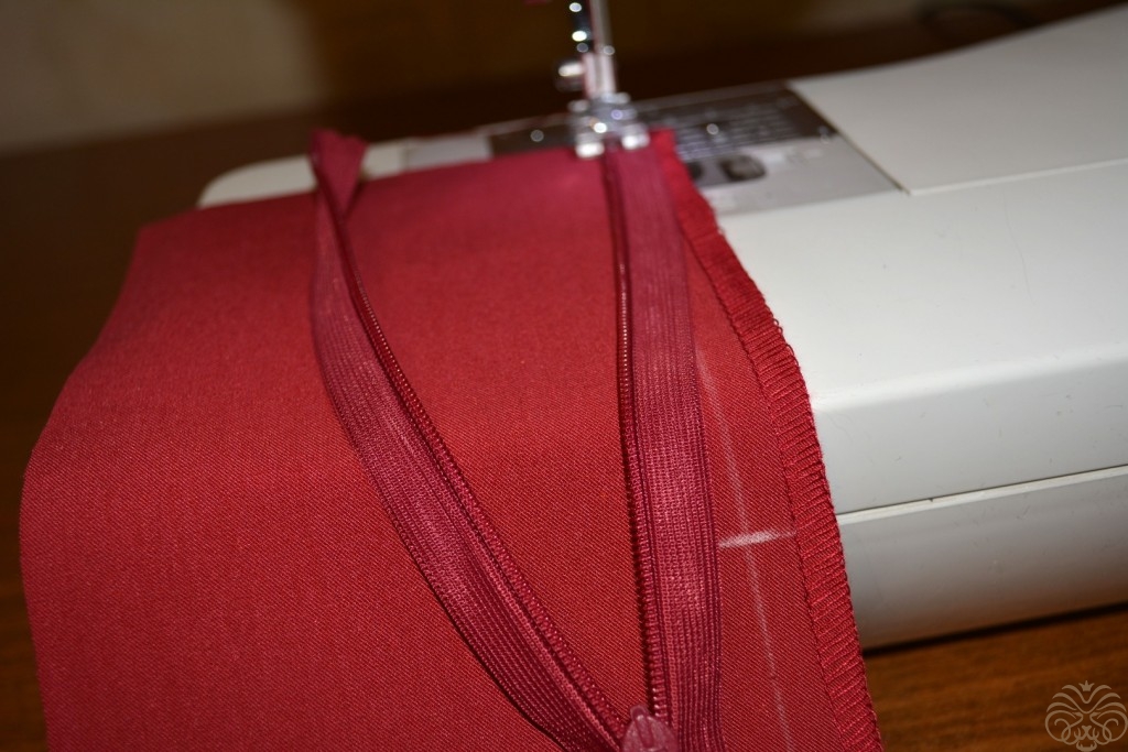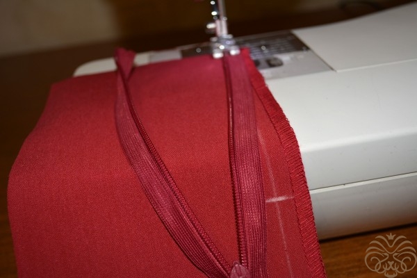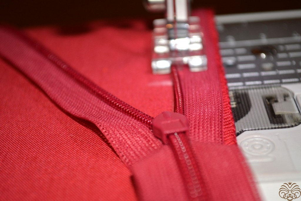4. Накладываем молнию бегунком на лицевую сторону изделия. Аккуратно устанавливаем лапку на "зубки" молнии, обязательно настраиваем отклонения иглы, для того чтобы пришить как можно ближе к тесьме, НО! будьте внимательны не прошейте звенья, это опасно тем, что молния будет испорченна!