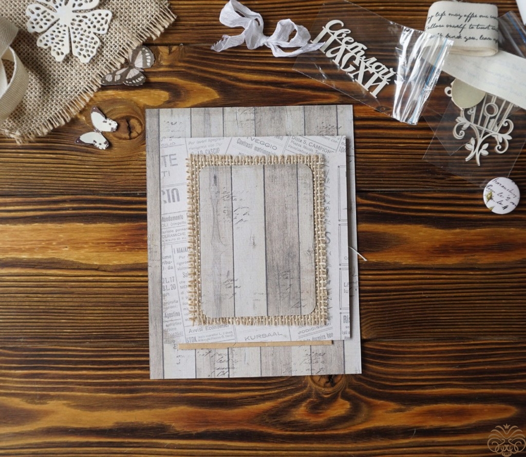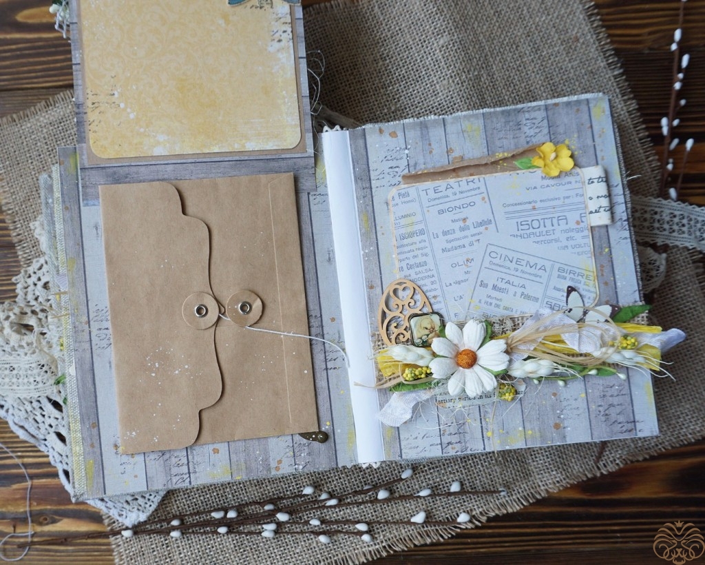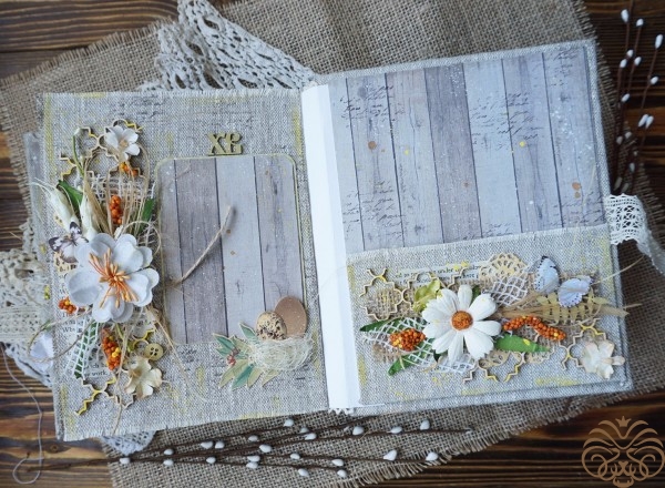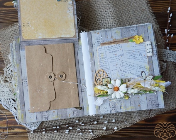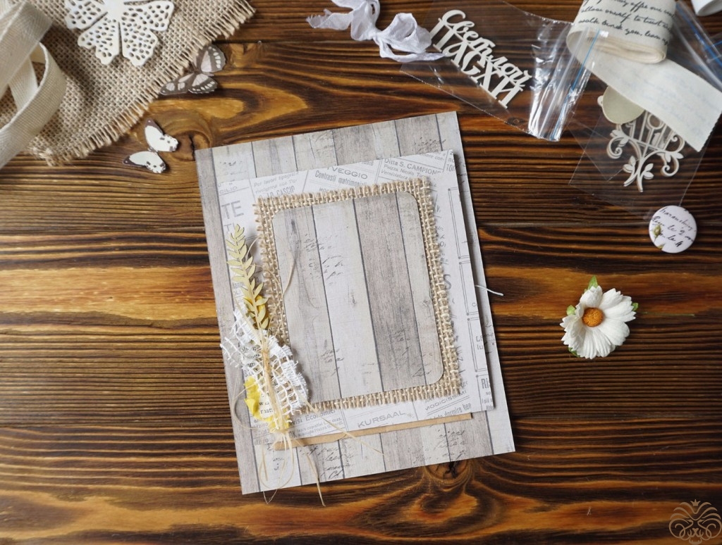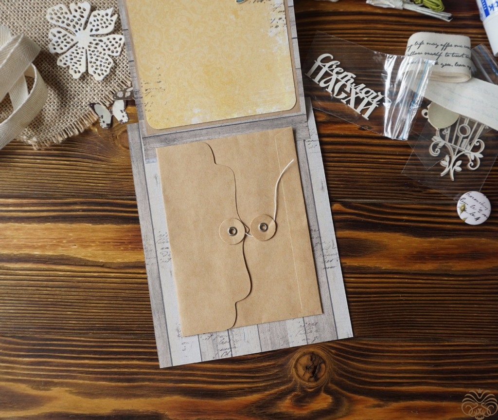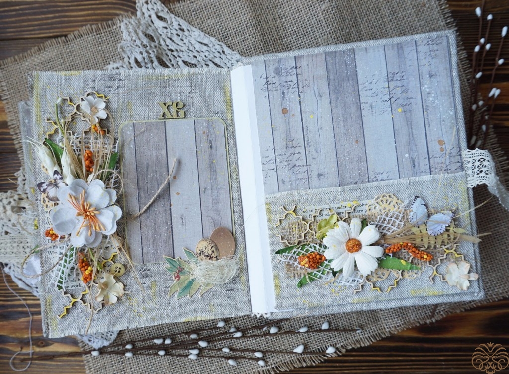 В альбоме, кроме мест для фотографий есть два больших кармана для тегов с рецептами, достаточно вместительный конвертик и открывашка с местом для записей. Я выбрала эко-тему, поэтому использовала деревянные фоны, лен, мешковину, различные натуральные материалы.