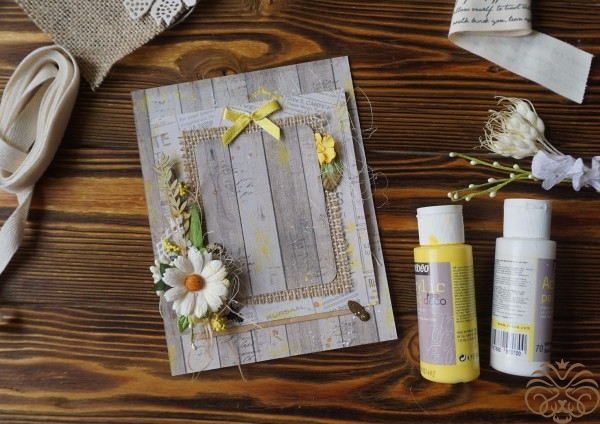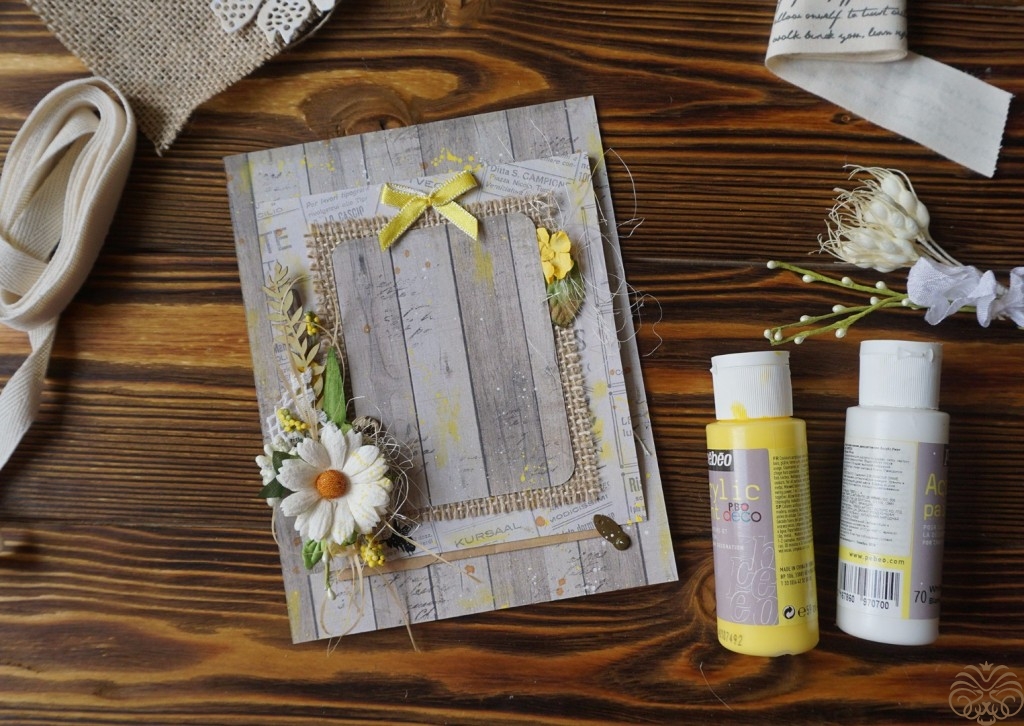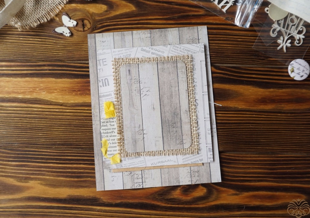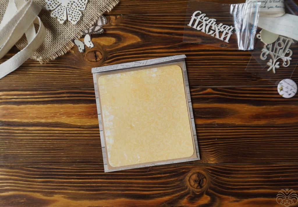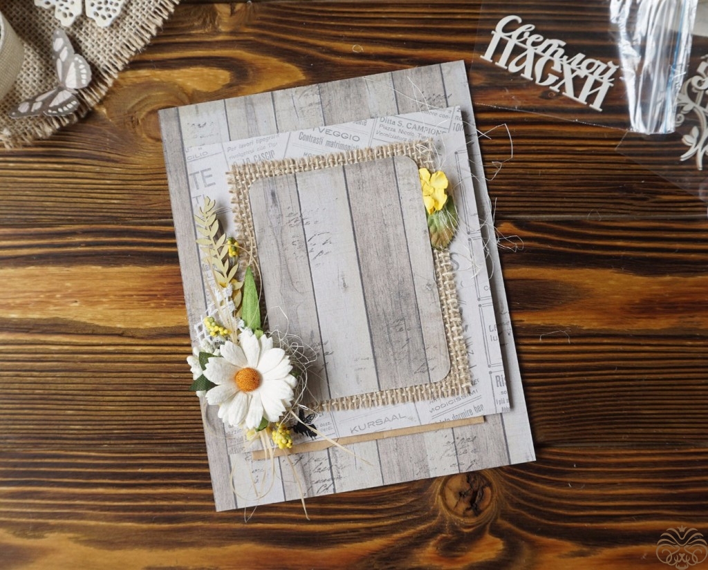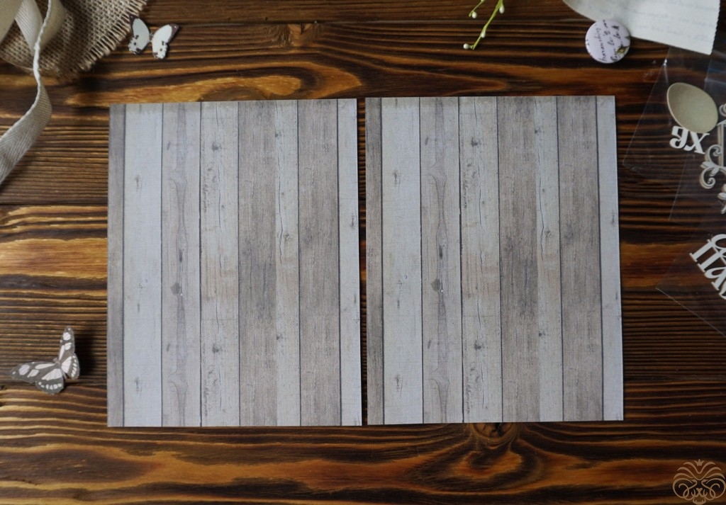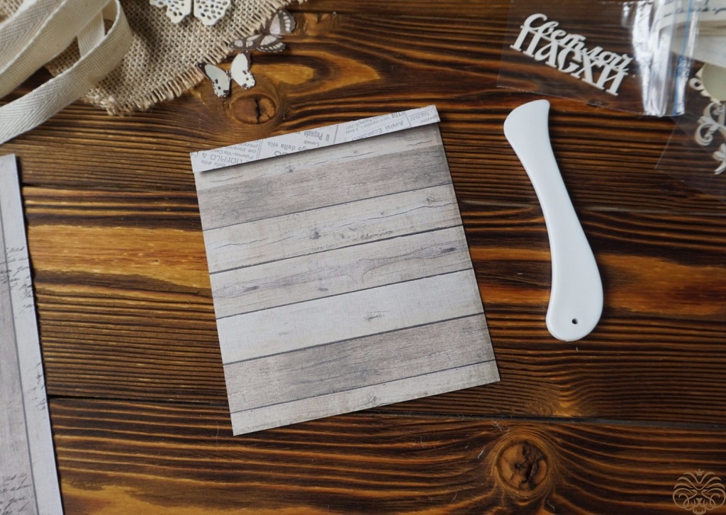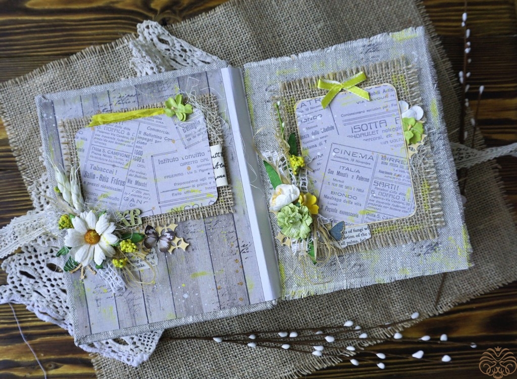 В альбоме, кроме мест для фотографий есть два больших кармана для тегов с рецептами, достаточно вместительный конвертик и открывашка с местом для записей. Я выбрала эко-тему, поэтому использовала деревянные фоны, лен, мешковину, различные натуральные материалы.