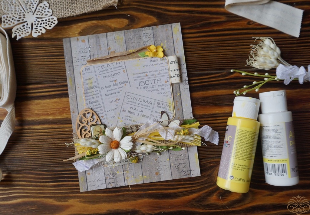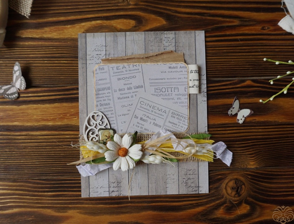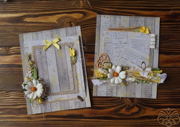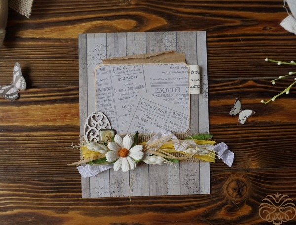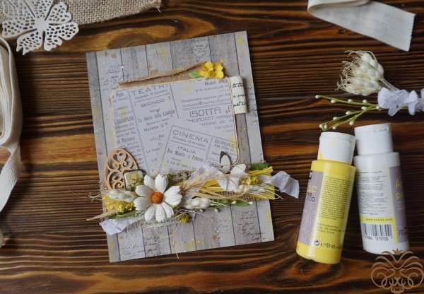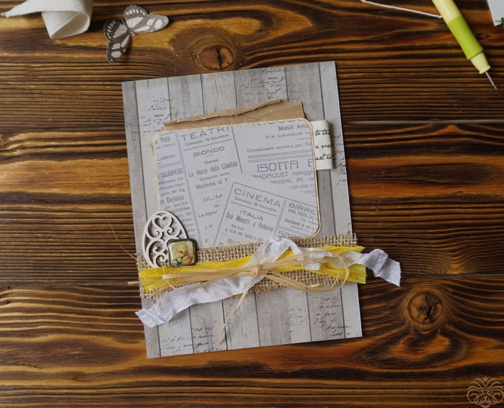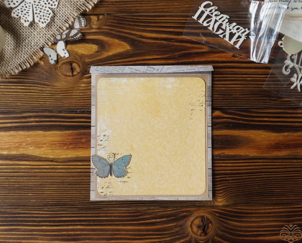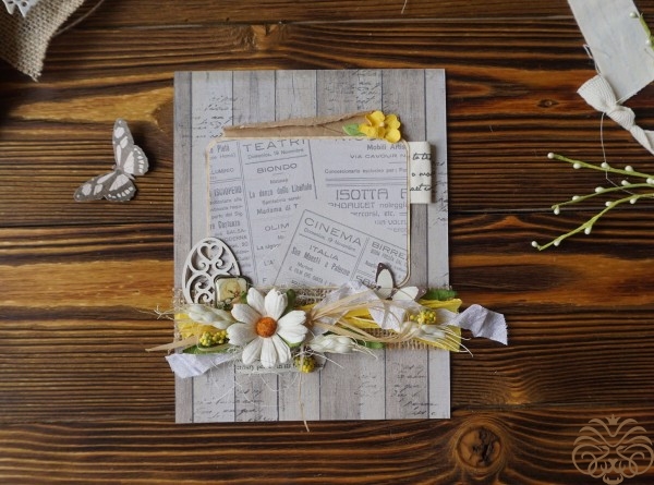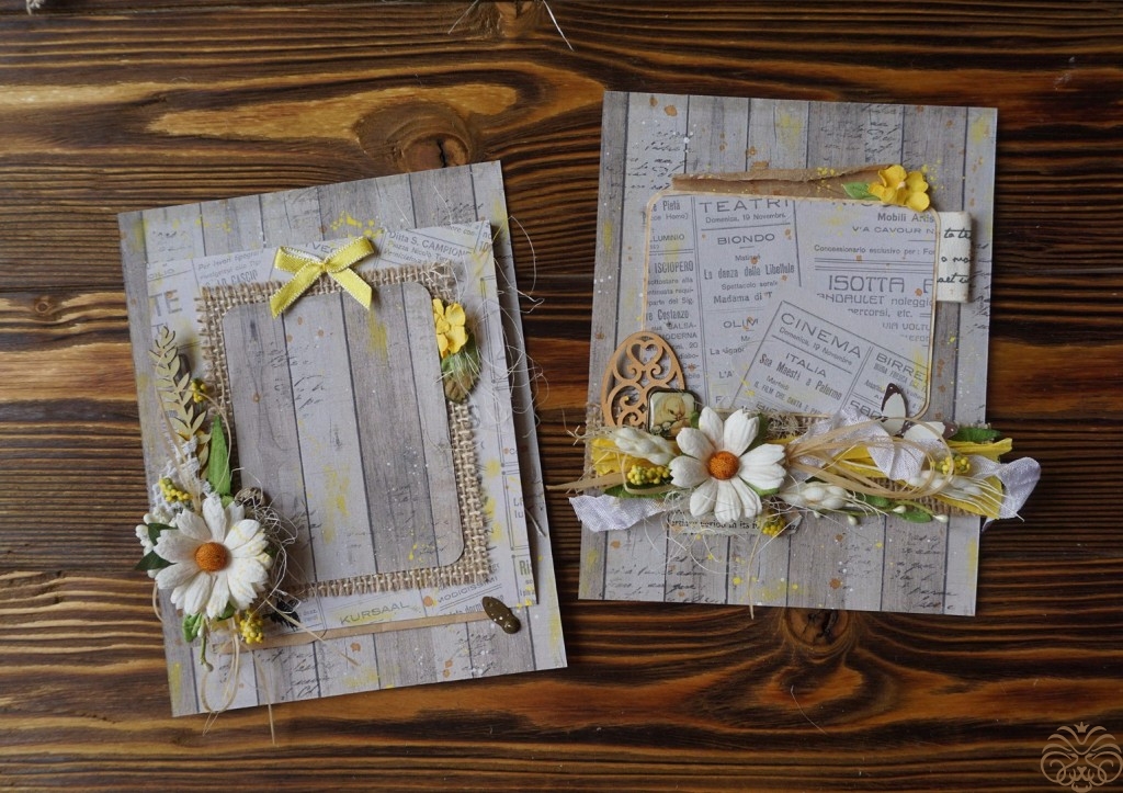 В альбоме, кроме мест для фотографий есть два больших кармана для тегов с рецептами, достаточно вместительный конвертик и открывашка с местом для записей. Я выбрала эко-тему, поэтому использовала деревянные фоны, лен, мешковину, различные натуральные материалы.