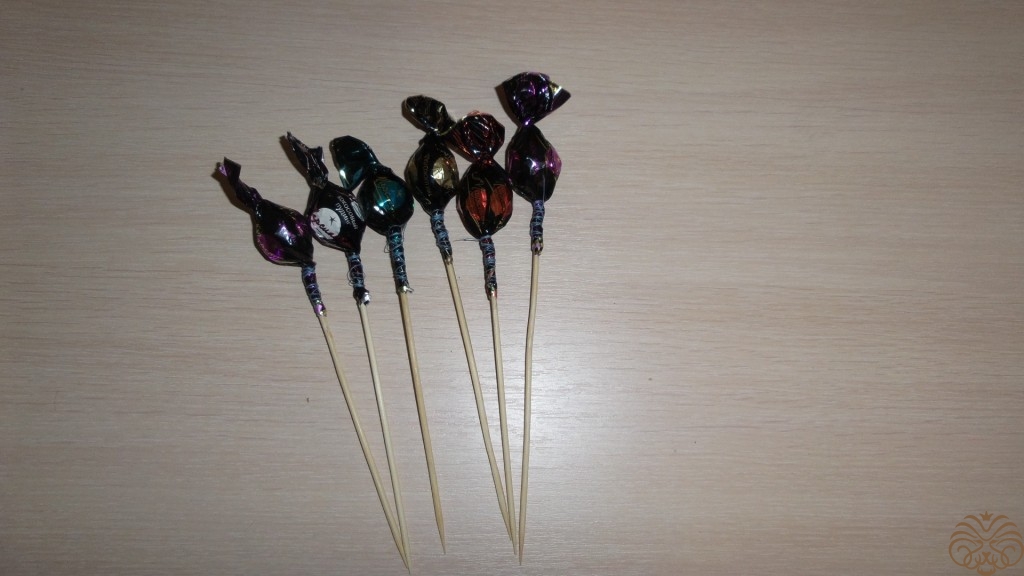 Для начала необходимо закрепить конфеты на палочках — это можно сделать скотчем или нитками за один из хвостиков конфеты.