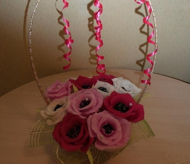 Первый лепесток закручиваем на конфетку и закрепляем армированной нитью. Второй лепесток закрепляем с противоположной стороны. Далее чередуем лепестки, заходя друг на друга каждым последующим. Делаем нужное количество роз из конфет — их удобно ставить в литровую банку в процессе изготовления, чтобы лепестки не помялись, лежа на боку.