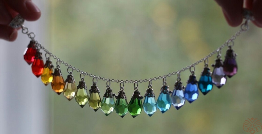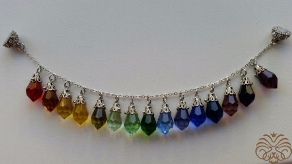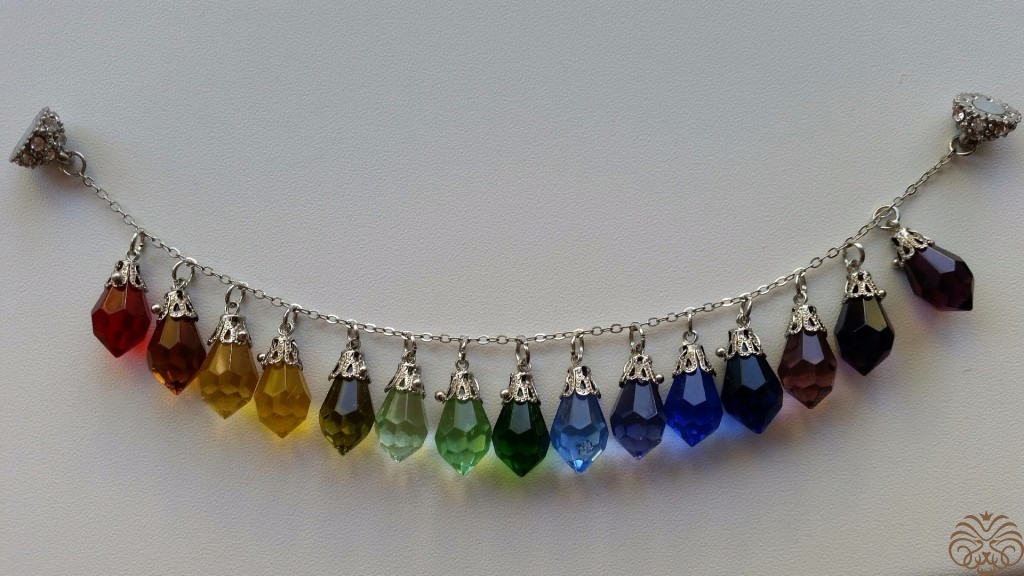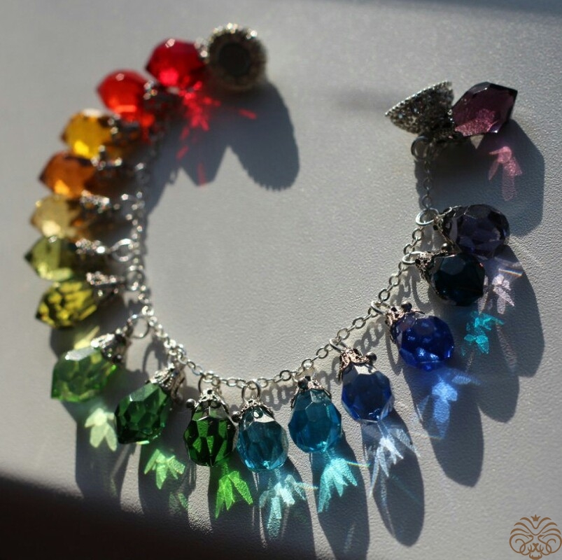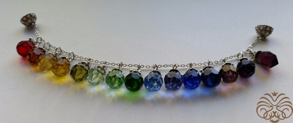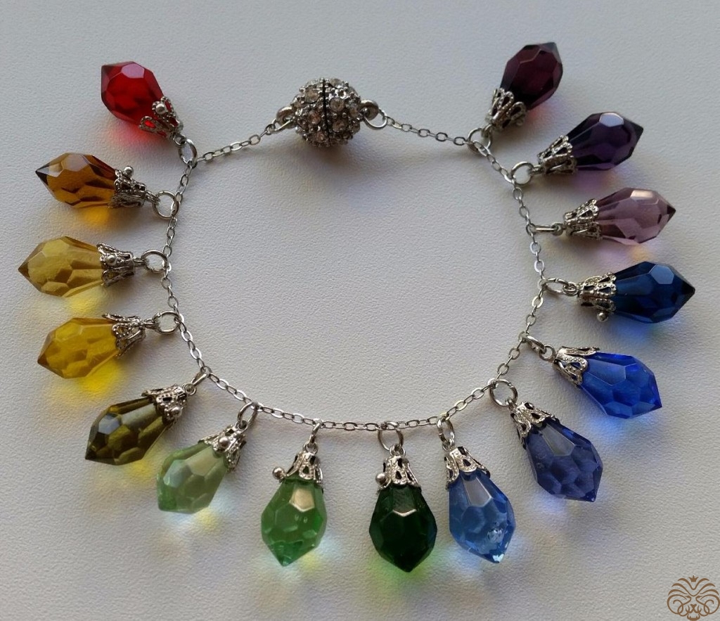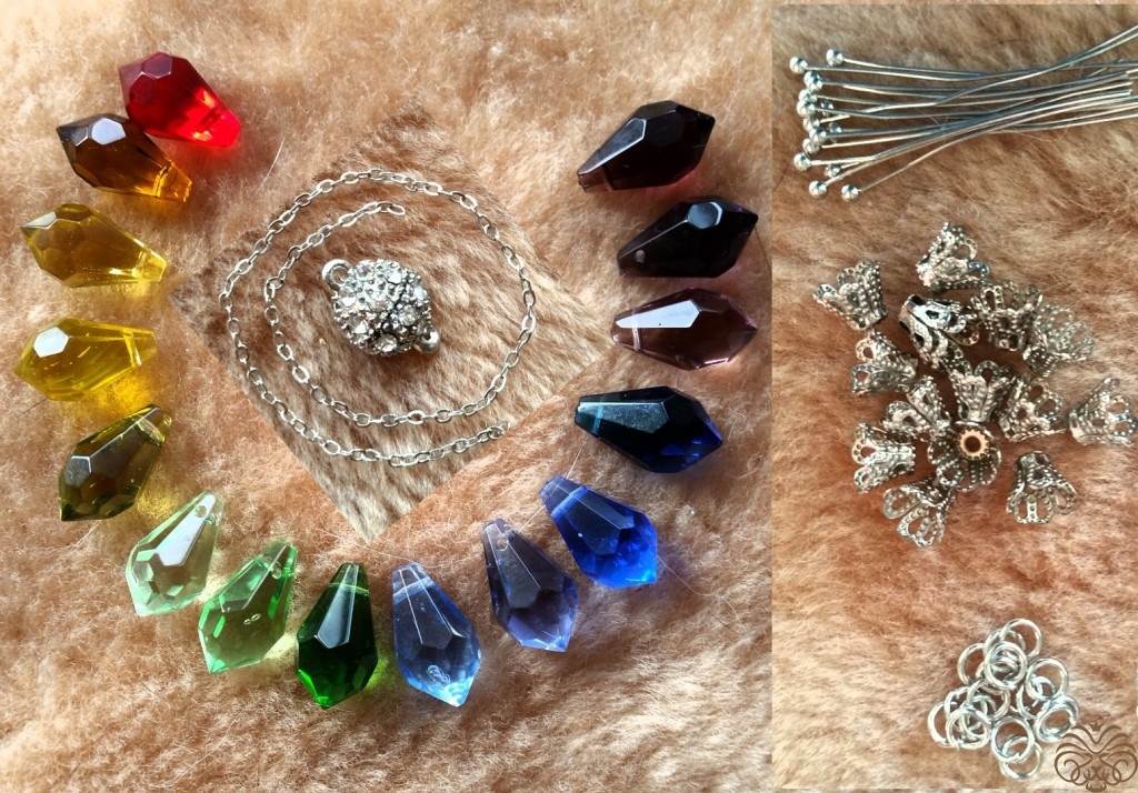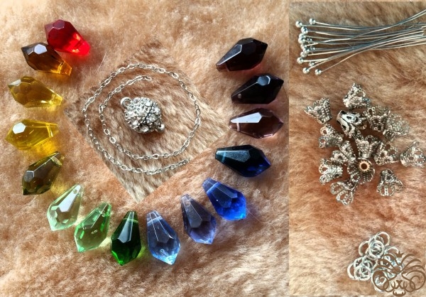Фурнитура: бусины из стекла с огранкой в форме капли(подбираем "радугу", длина бусины 1,6 см) - 15 шт, магнитная застежка ( главное, чтобы магнит был крепким, для избежания слёта браслета с руки, длина застежки 1,5 ) - 1 шт, тонкая цепочка 15,5 см, соединительные колечки - 17 шт, пин-шарик (3см) - 15 шт, ажурные колпачки( диаметр 6 мм) - 15 шт.